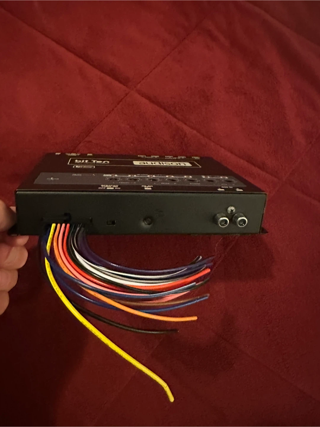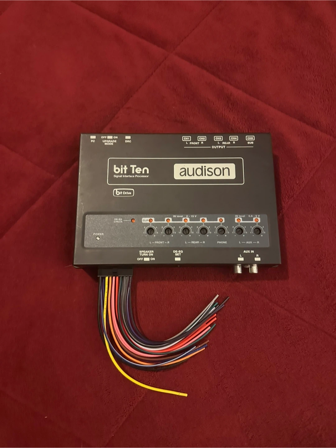 This is an Audison Bit Ten digital crossover processor. It's a compact unit for car audio systems. It includes wiring harness.