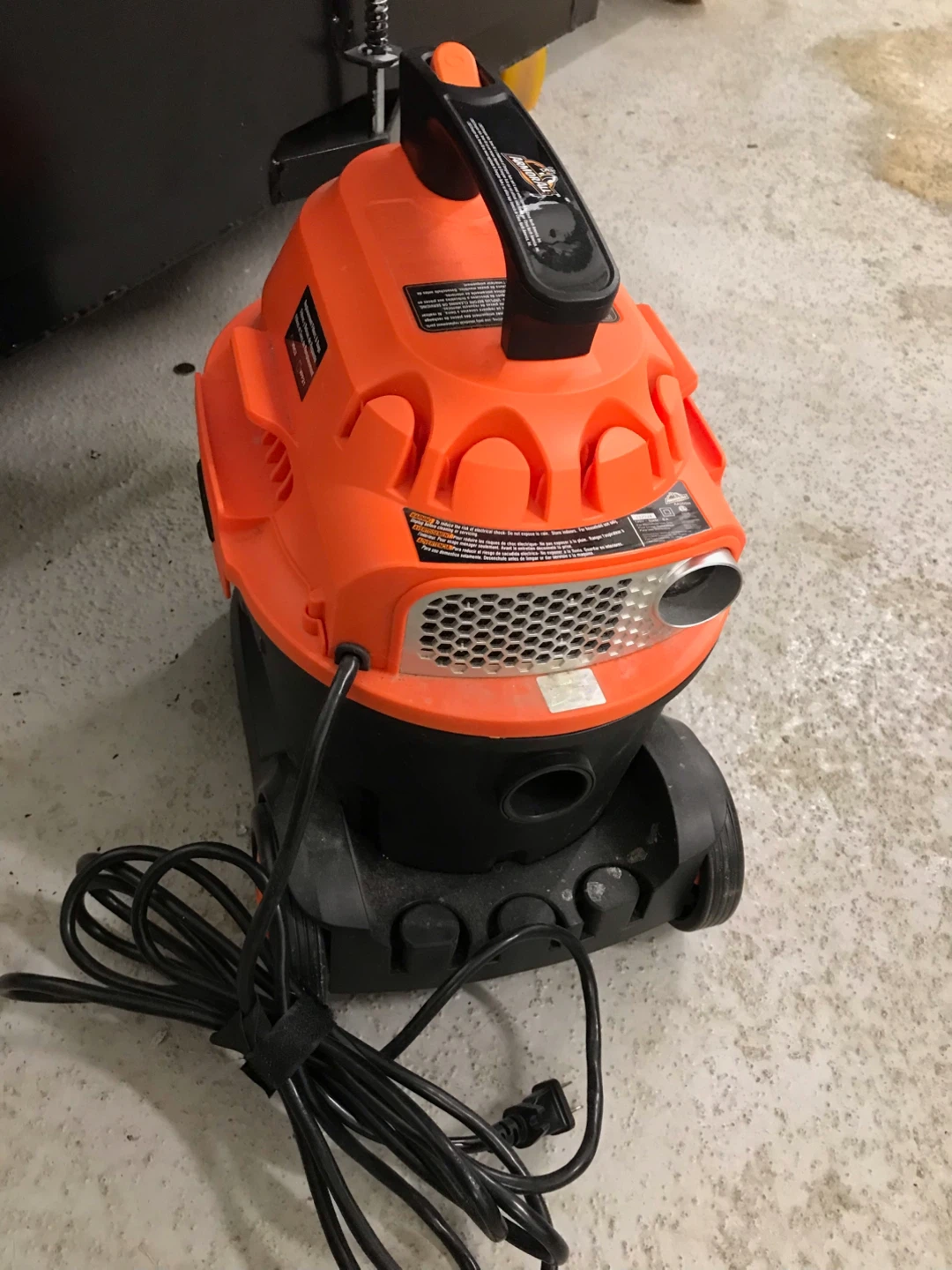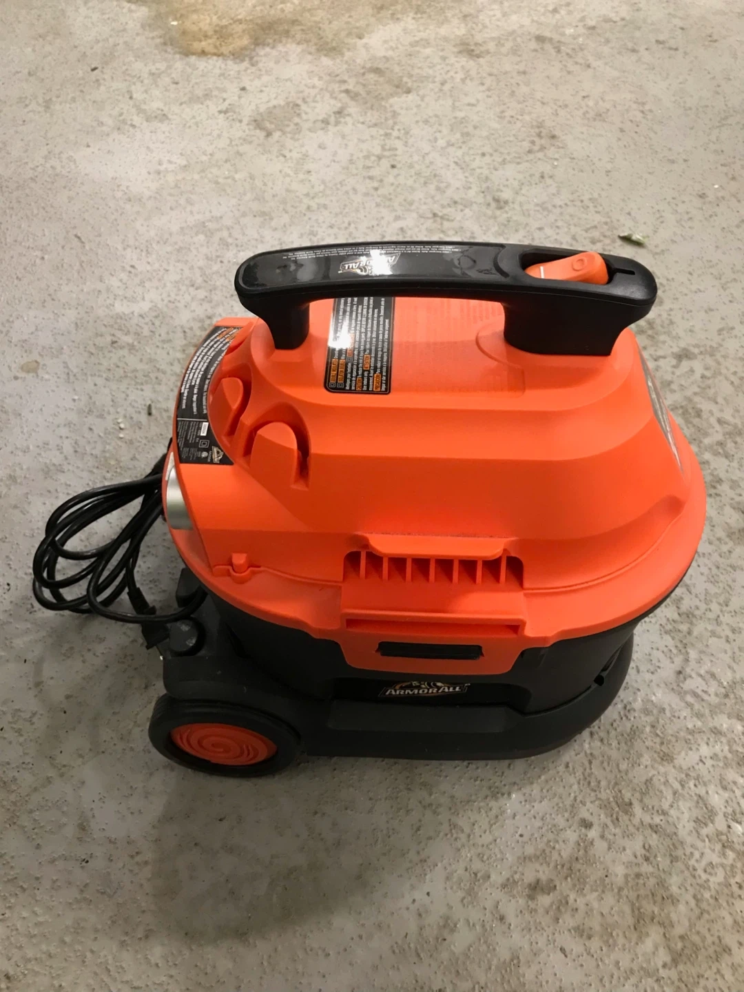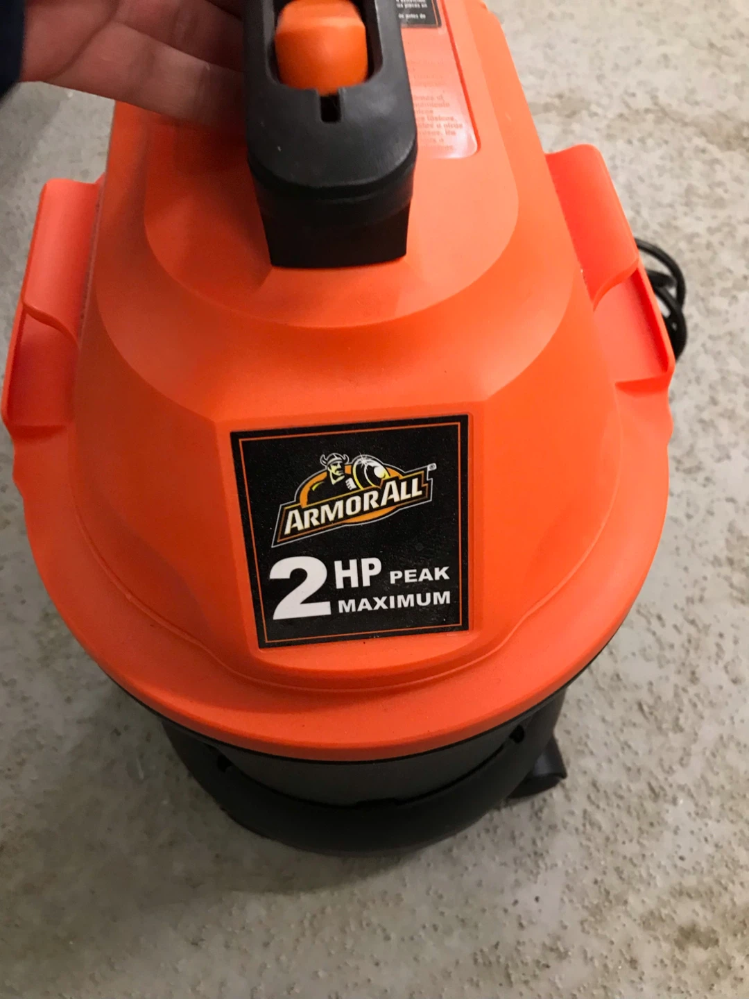 This is an Armor All 2 HP peak maximum wet/dry vacuum. It's orange and black. It includes the vacuum, nozzles and power cord.
