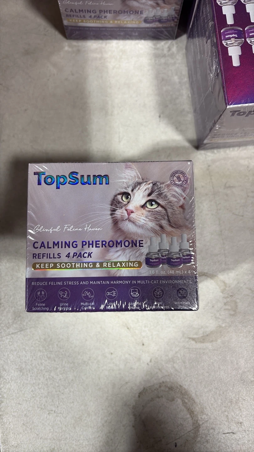 TopSum Calming Pheromone Refills for a blissful feline haven. This pack contains 4 refills, each 1.6 fl. oz. (48 mL). It's designed to reduce feline stress and maintain harmony in multi-cat environments, helping with issues like scratching, marking, and conflicts. The formula is odour-free.