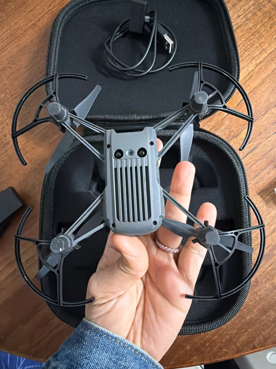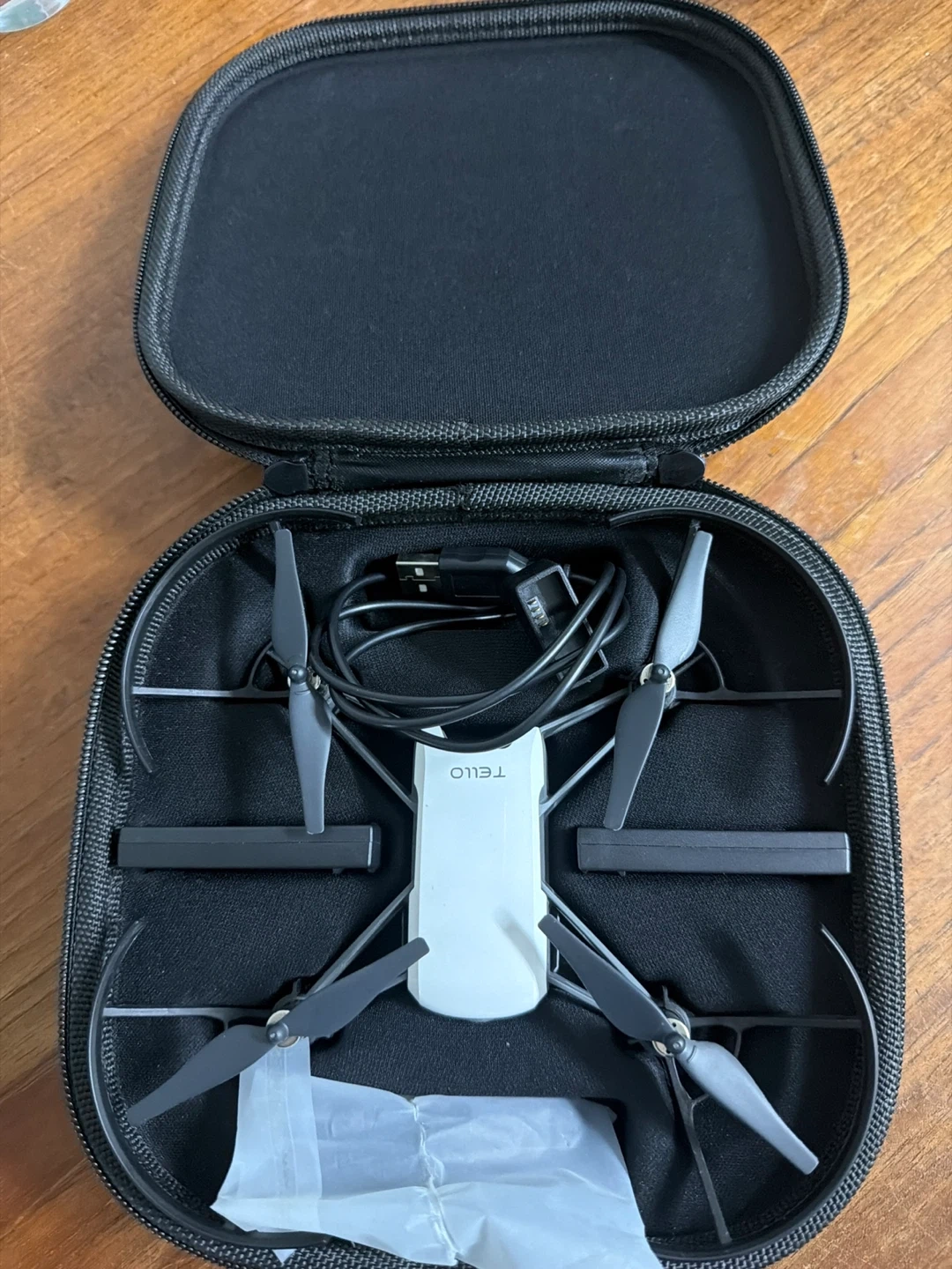 This white TELLO drone comes with a carrying case and includes a USB charging cable and two batteries. It's a compact drone for aerial photography and fun flights. Great for beginners interested in drone technology!