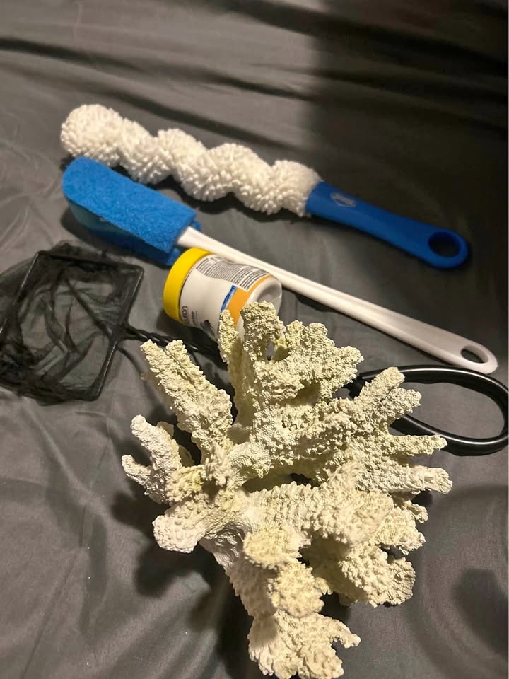 2 glass aquarium scrubbers, 1 coral (preferably saltwater), 1 net, and 1 betta fish food. Items can be purchased individually.