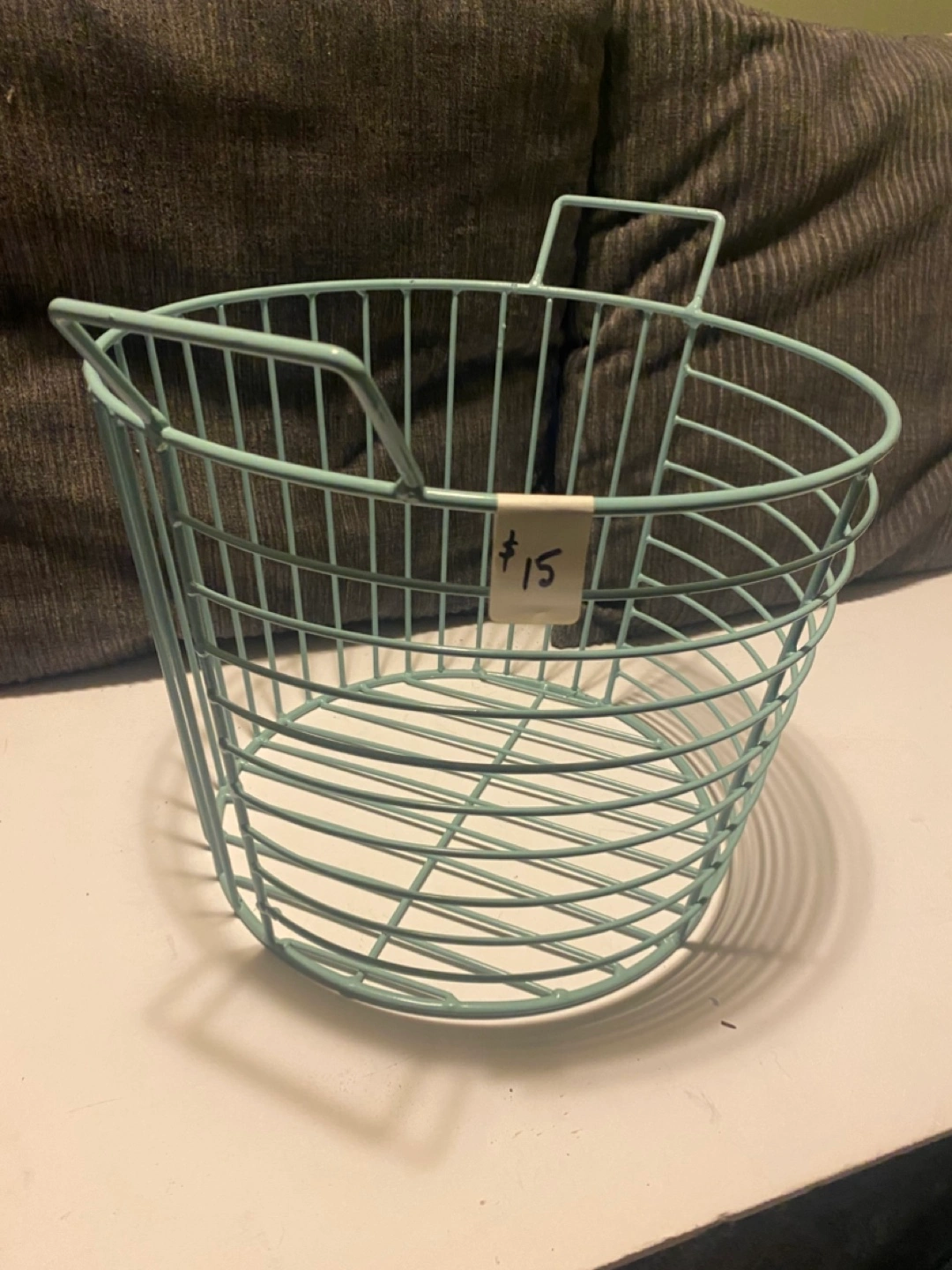 Here's a cute light blue/green pastel wire basket! It has handles for easy carrying. It's in great shape and ready to hold your things. The original price was $15