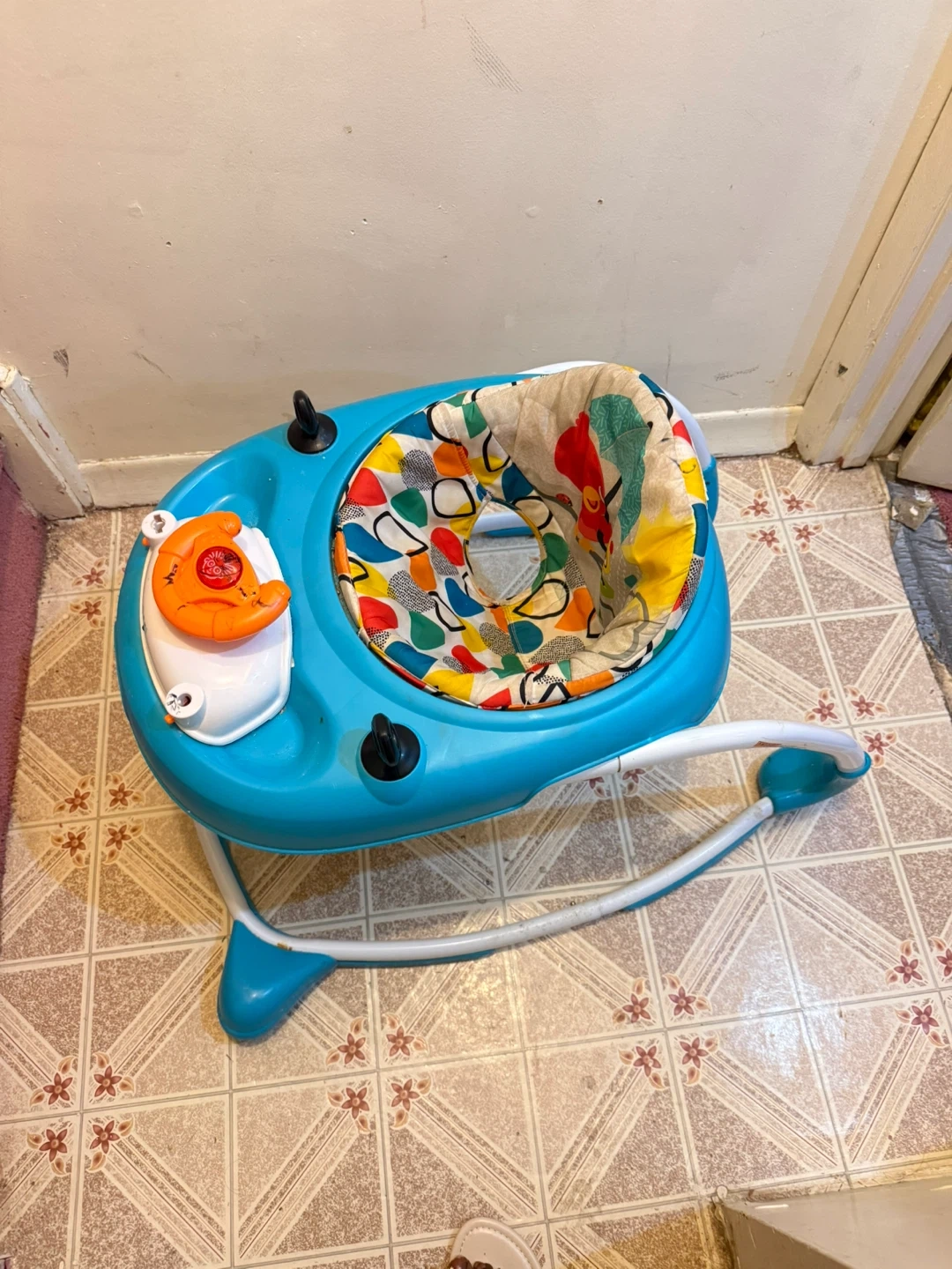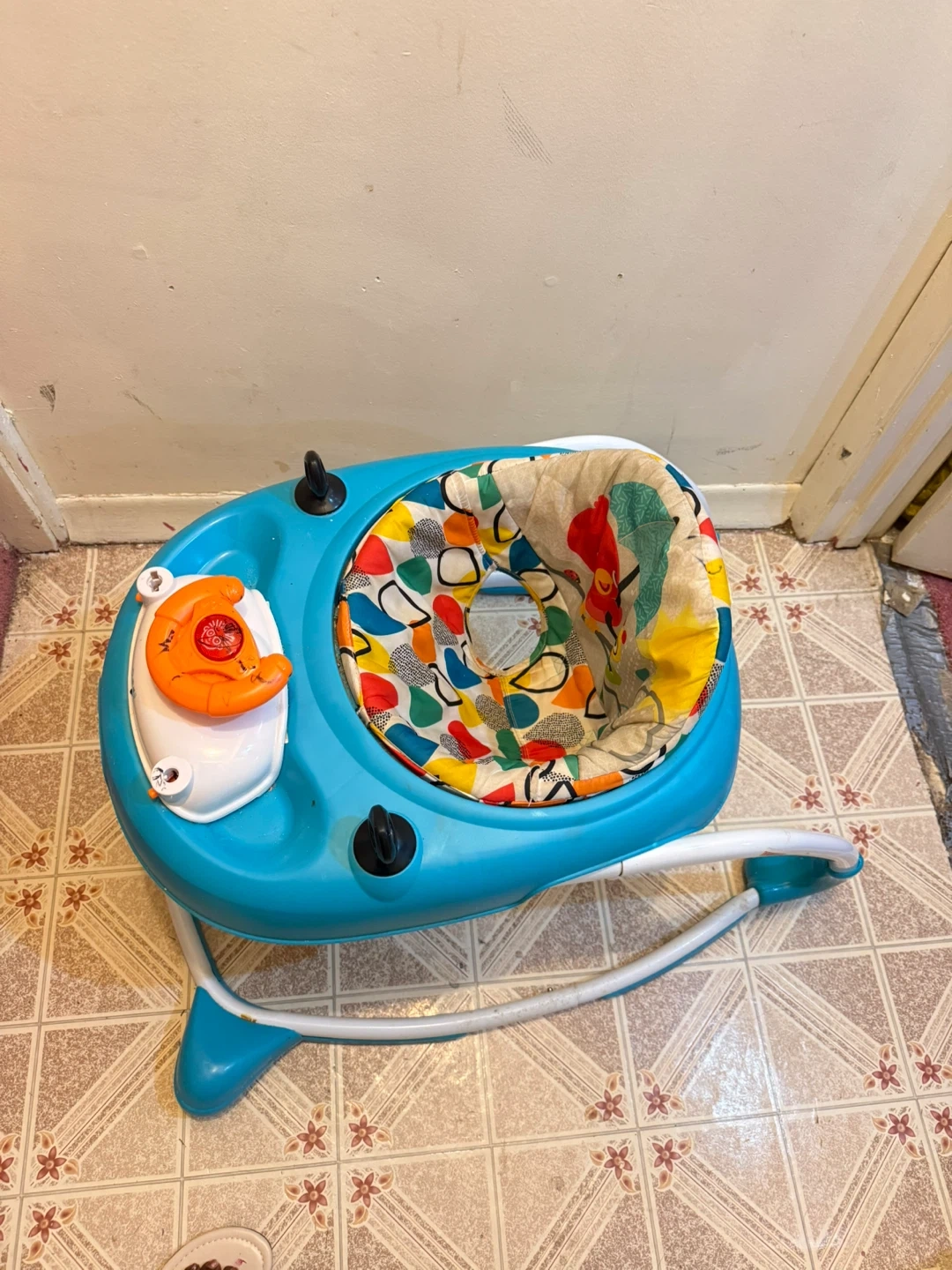 This blue Fisher-Price baby walker has a colourful seat insert with heart and teardrop shapes. It features an orange toy on the front for entertainment. It's designed to help babies learn to walk.