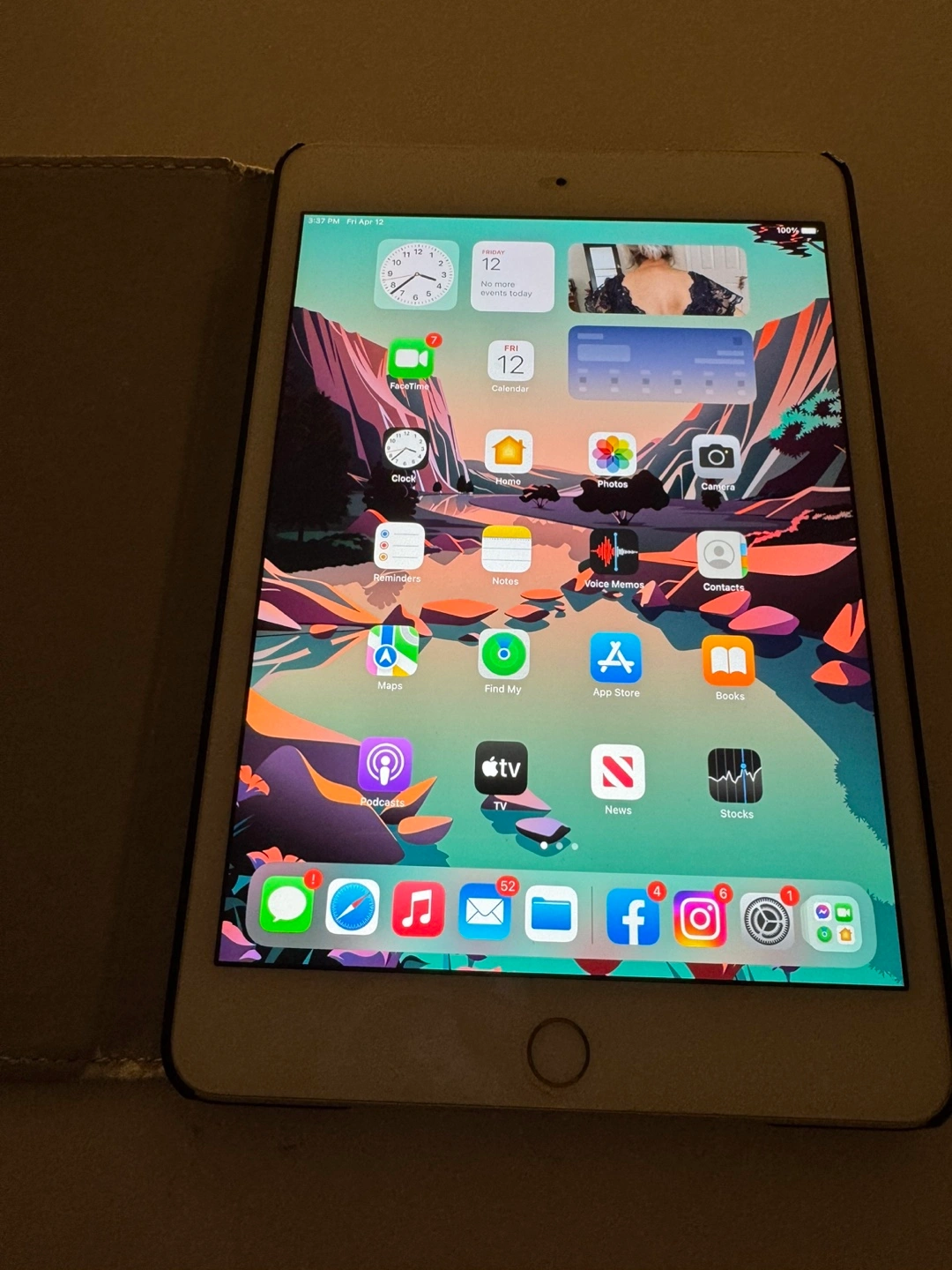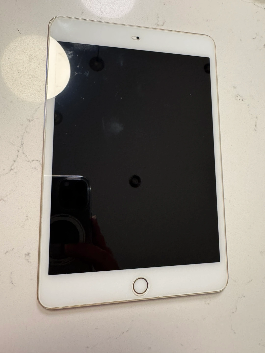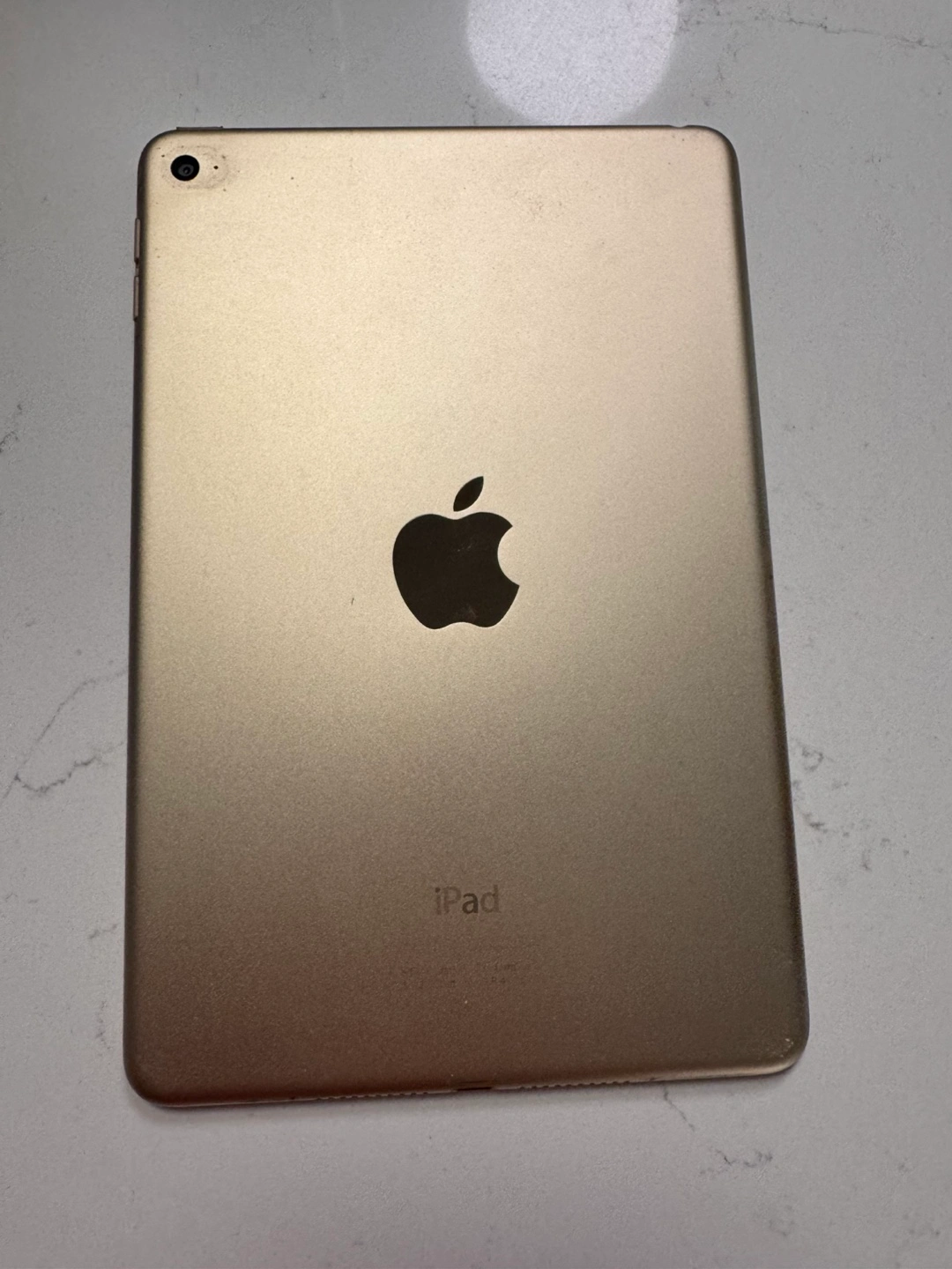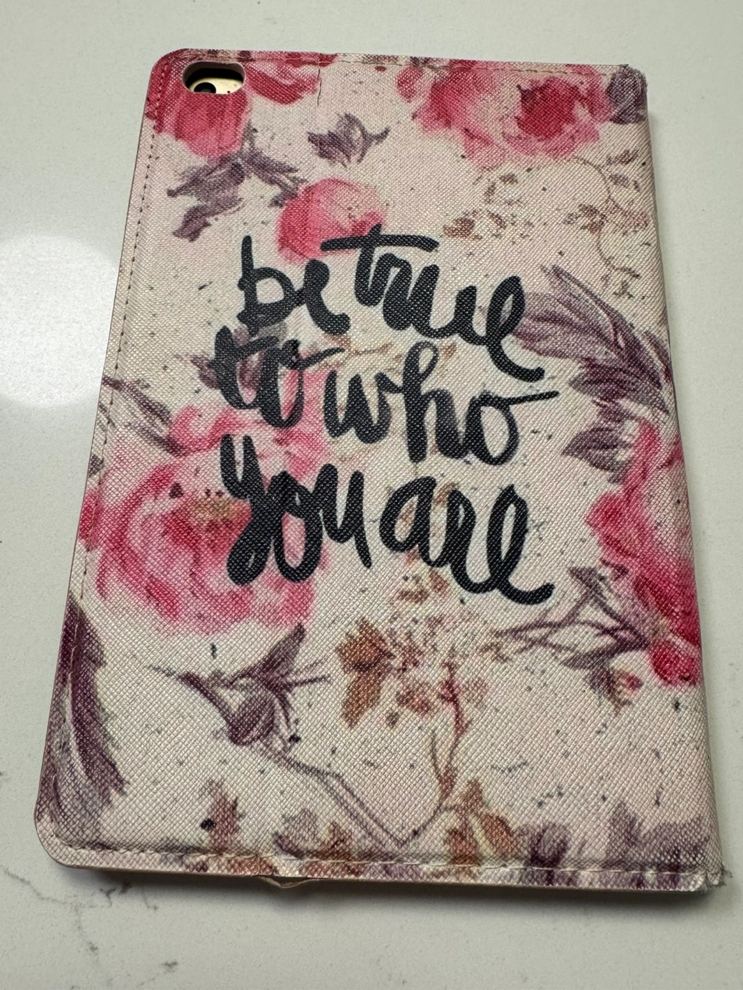 Pre-owned iPad Mini in gold. Includes a floral case with a quote. Screen protector applied.Pick up in Oakville.