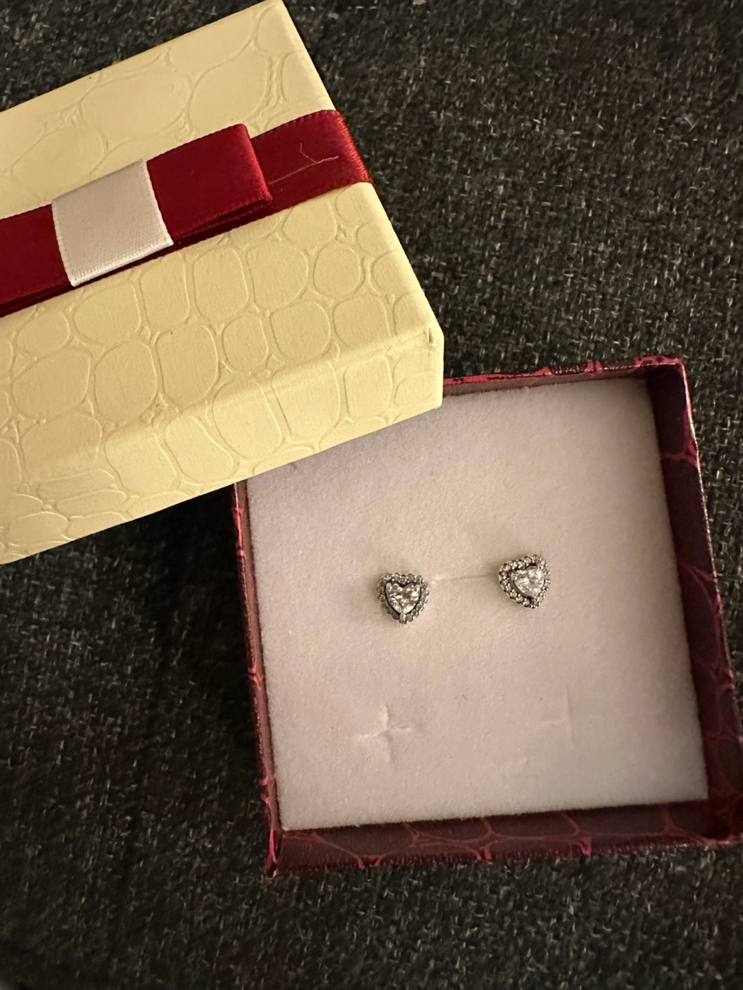 Beautiful heart-shaped stud earrings. Clear cubic zirconia accents. 925 Silver. Presented in a gift box. Elegant and stylish.