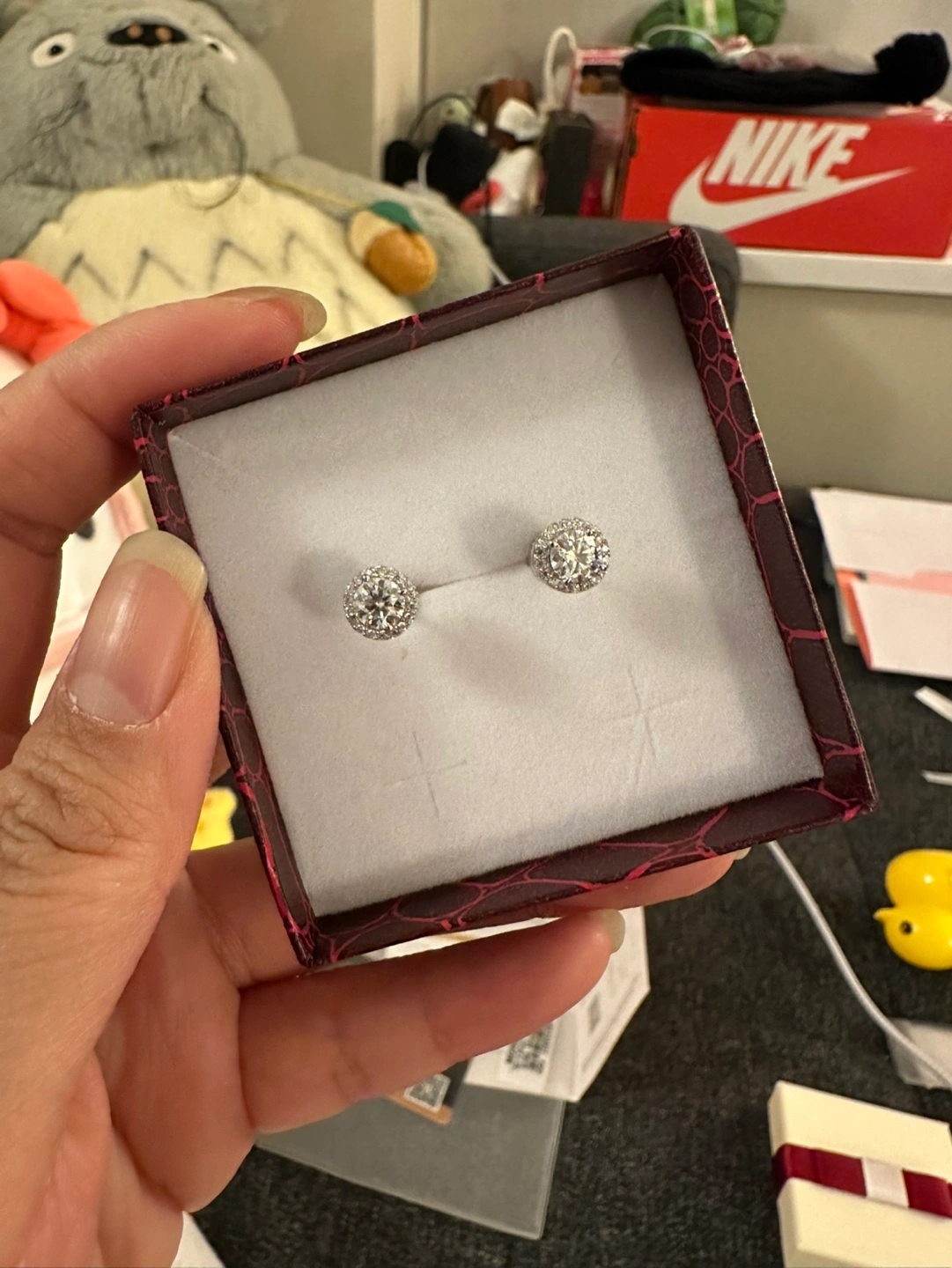 119Beautiful pair of moissanite stud earrings. Presented in a lovely red box. Includes grading report. Sparkling stones. 1ct(0.5x2)