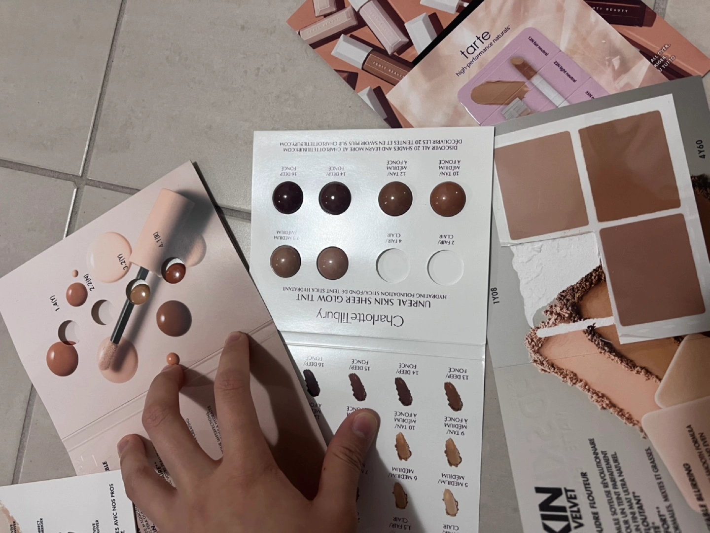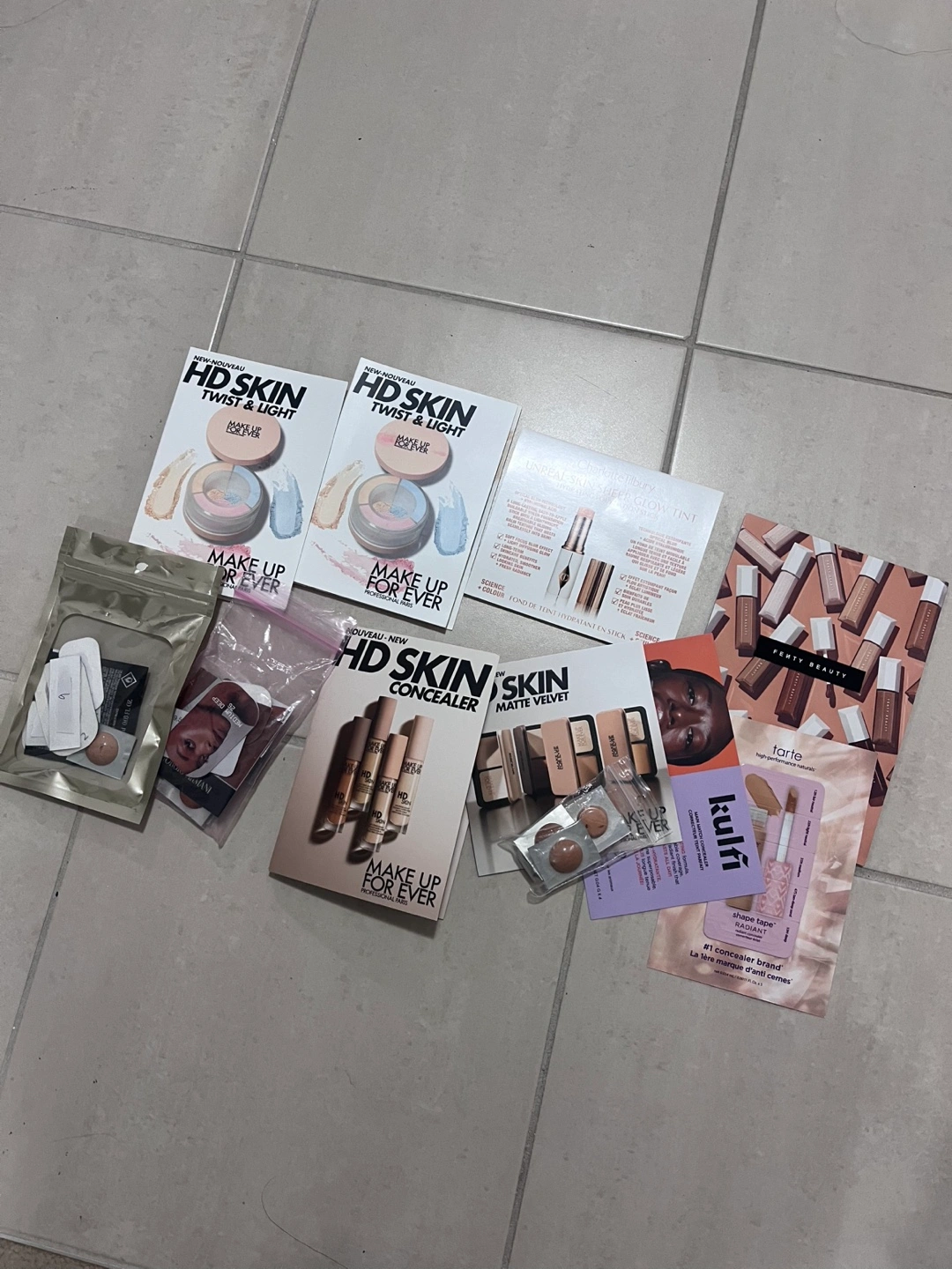 Large collection of various makeup brand samples. Includes foundation, concealer, and complexion samples. Perfect for trying new products or travelling. Brands include Make Up For Ever, Tarte, and Charlotte Tilbury. Several unopened sample packets.