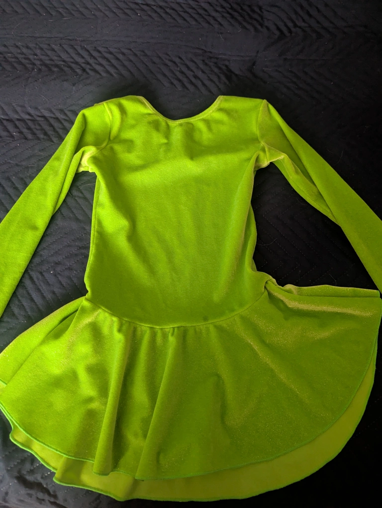 Girls' lime green figure skating dress. Long sleeves, fitted bodice, and layered skirt. Sparkly Velvet stretchy material.