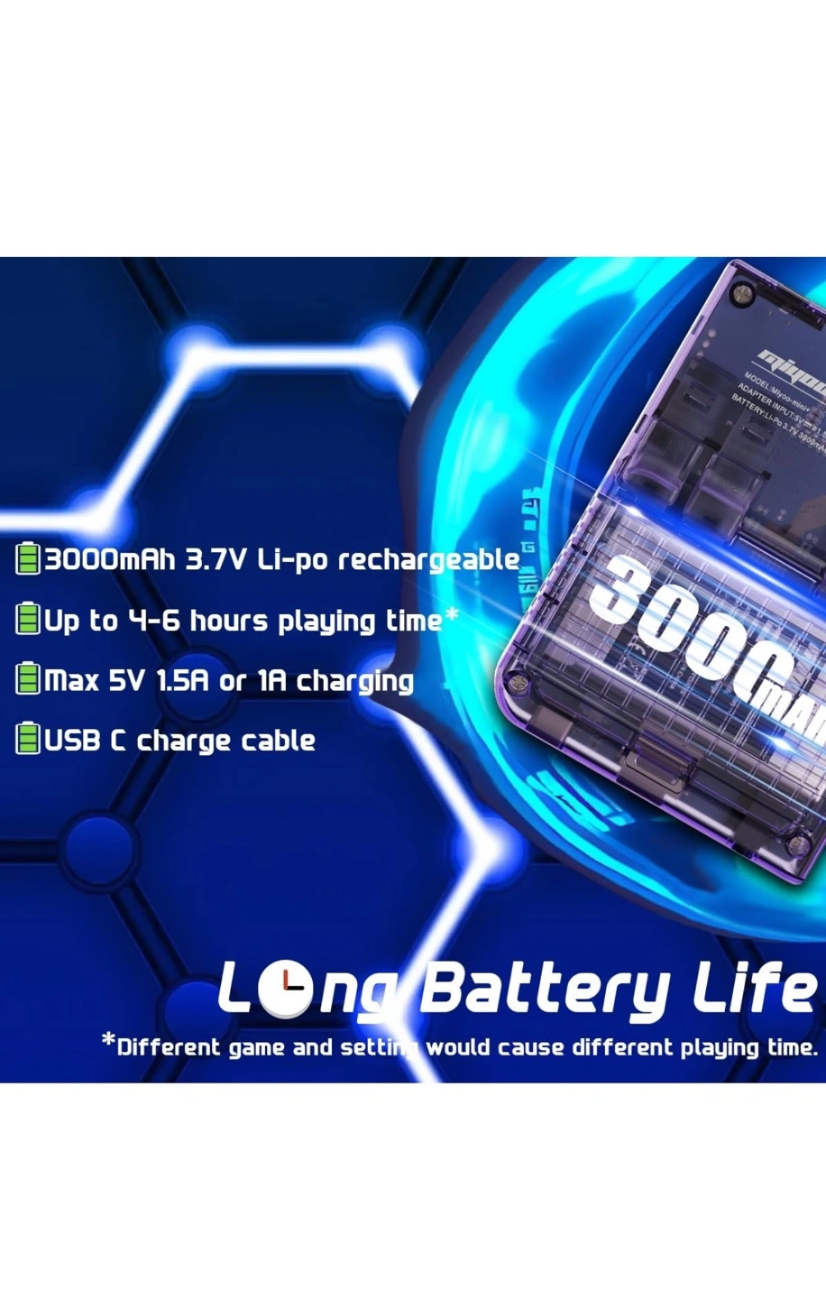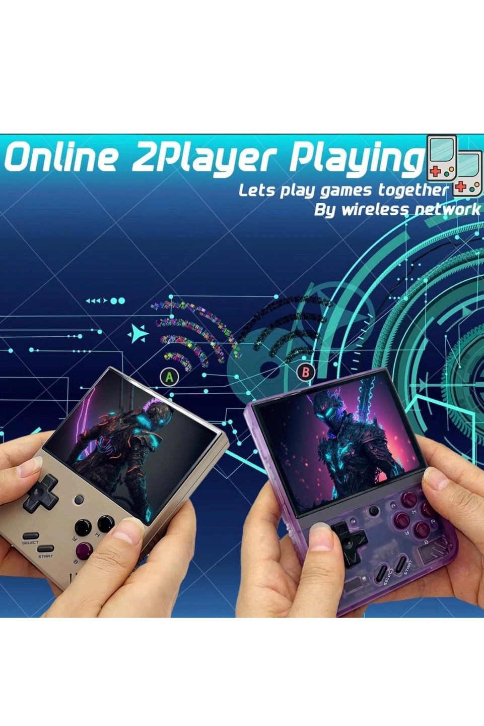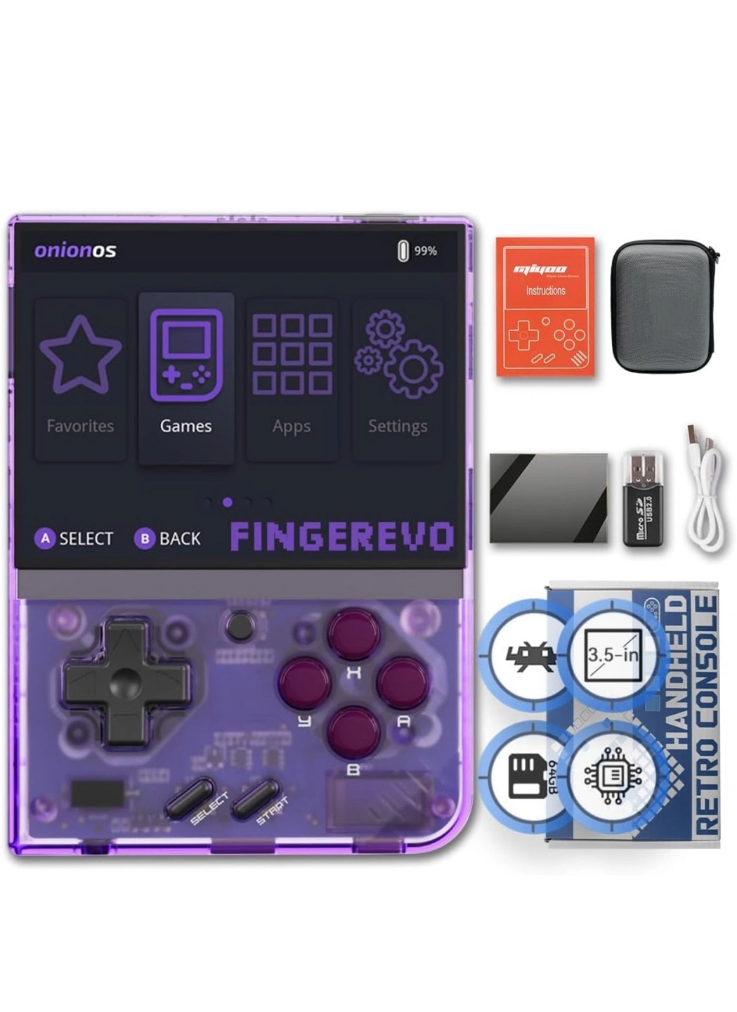 3.5-inch IPS screen, 640x480 resolution. A7 CPU, open-source RetroArch. WiFi for online 2-player gaming. Long battery life. Includes screen protector, USB-C charging cable, and carrying case.