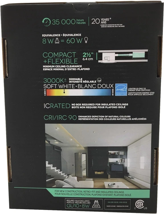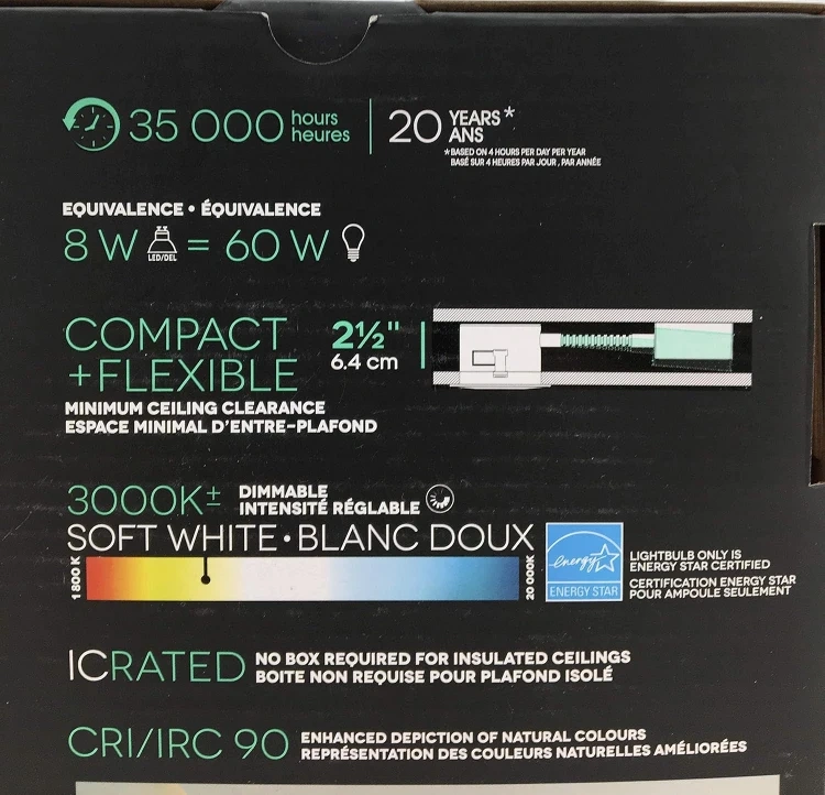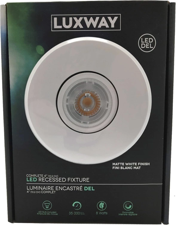 Brand new in box,complete 4-inch LED recessed light fixture. Matte white finish. Dimmable. 8W, equivalent to 60W. 3000K soft white light. Includes LED bulb. Air tight and fire rated. Low profile. Easy installation. IC-rated for insulated ceilings.