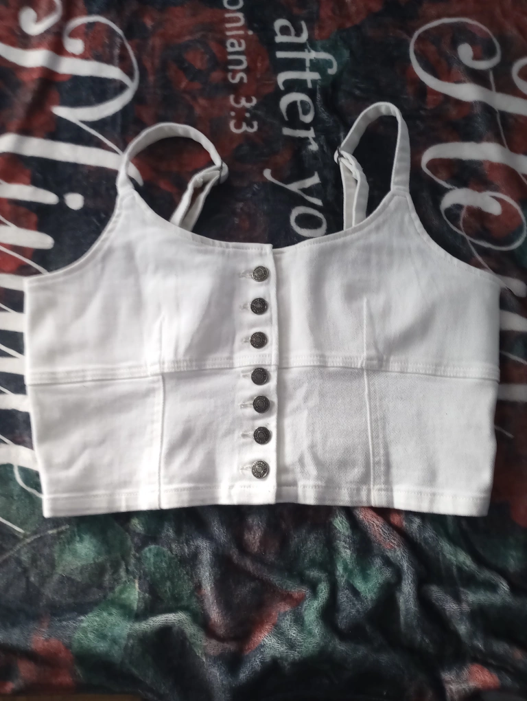 1000+Adorable white denim crop top. Features button closures and adjustable straps. Perfect for summer.
