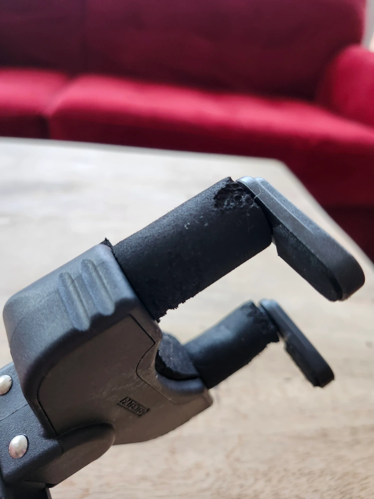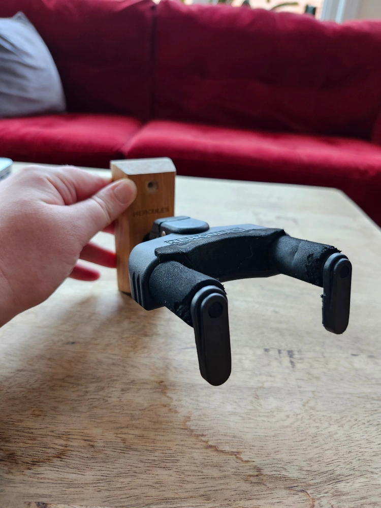 Wood & black plastic guitar wall mount. Shows some wear - friend's dog chewed on it when I was moving, but isn't that noticeable when mounted.