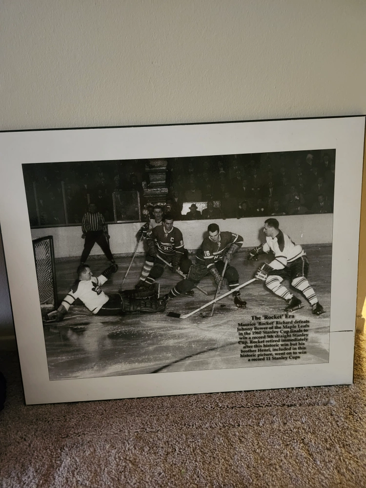 Framed black and white photo depicting a Montreal Canadiens hockey game. Features Rocket Richard and other players. Includes text describing the game and Richard's career.