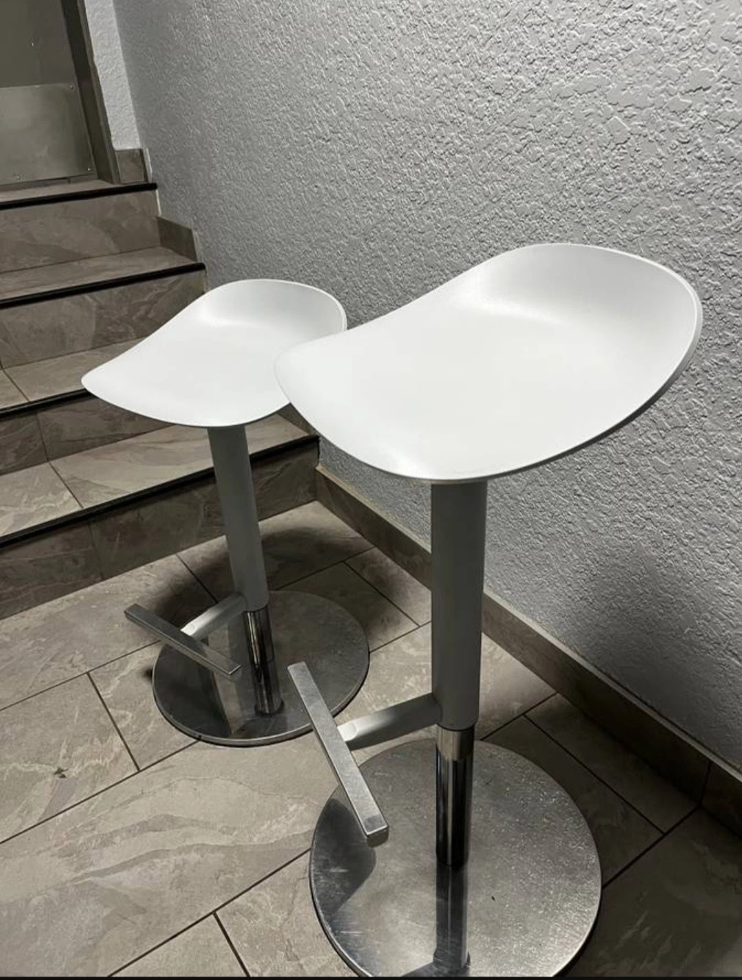 Two white grey bar stools. Adjustable height. Modern design. Chrome-like base. Good condition. 2 for $110