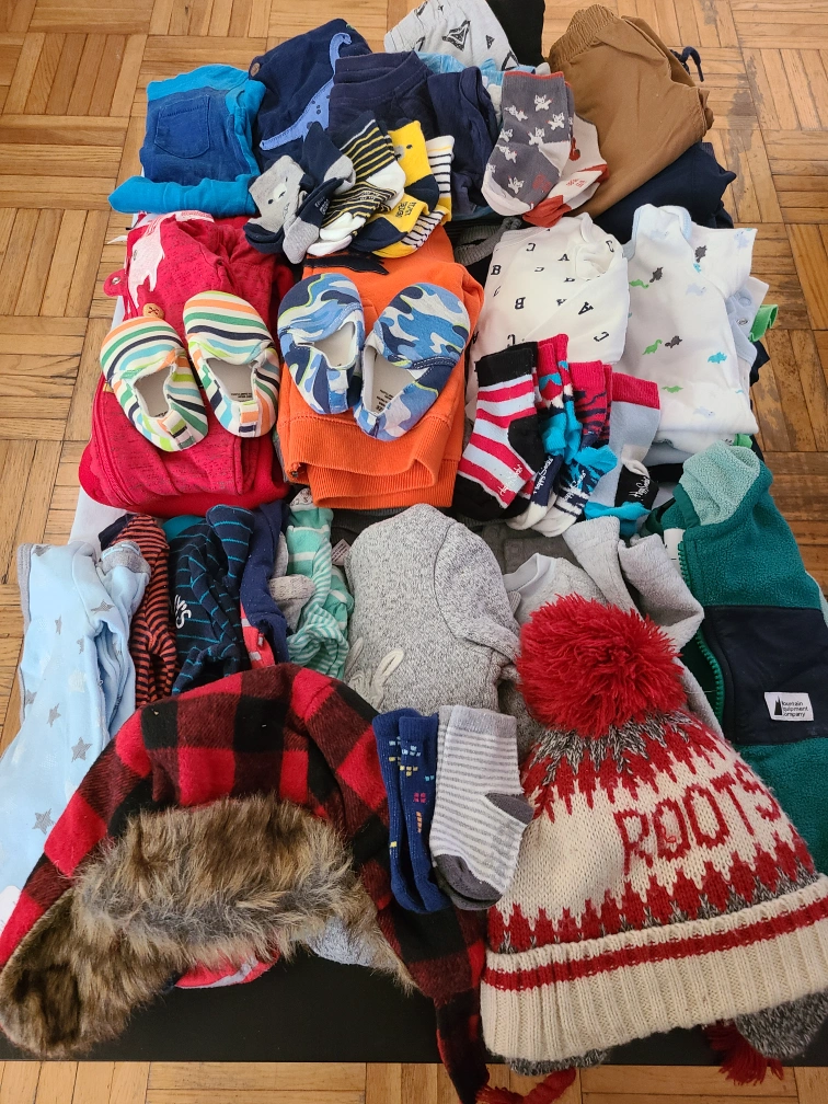 Large bundle of baby boy clothes, including sleepers, pants, sweaters, socks, hats, and shoes. Many different colours and patterns. Great for everyday wear. Perfect for a growing baby.