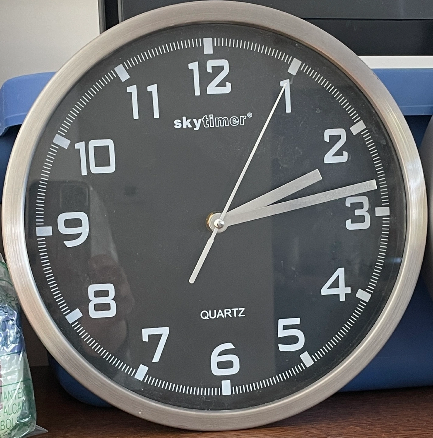 103Large round wall clock. Black face, silver bezel. Quartz movement. 10inch diameter. Requires one double A battery.