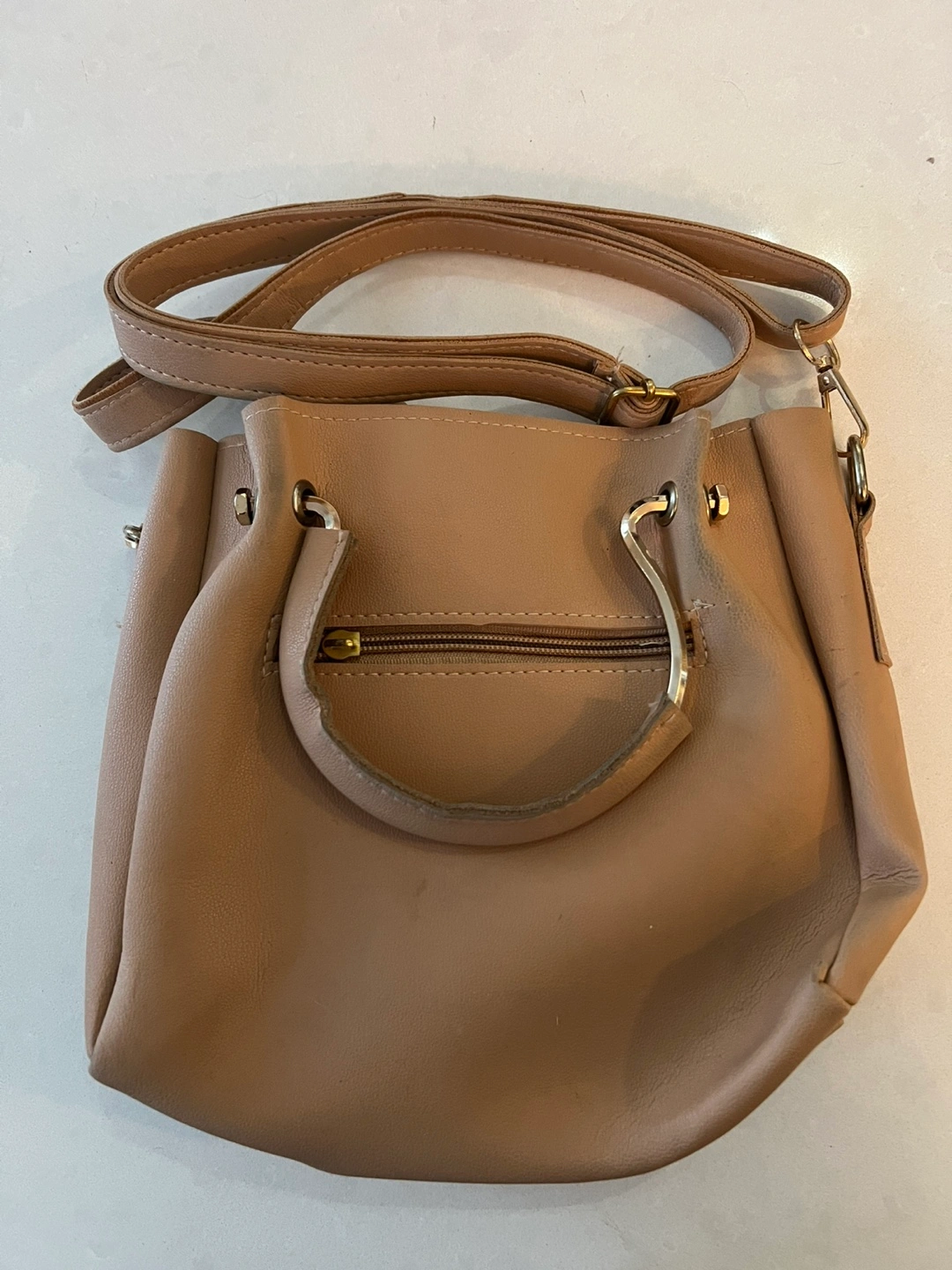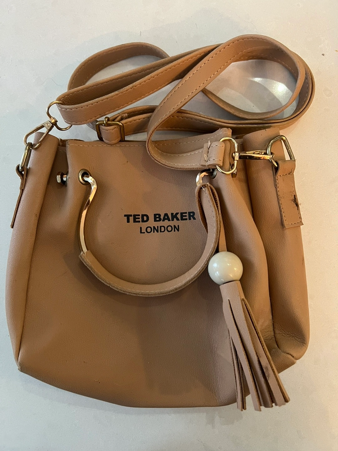 124Small tan crossbody bag. Features a top zip closure, adjustable strap, and a decorative tassel. Excellent for everyday use.