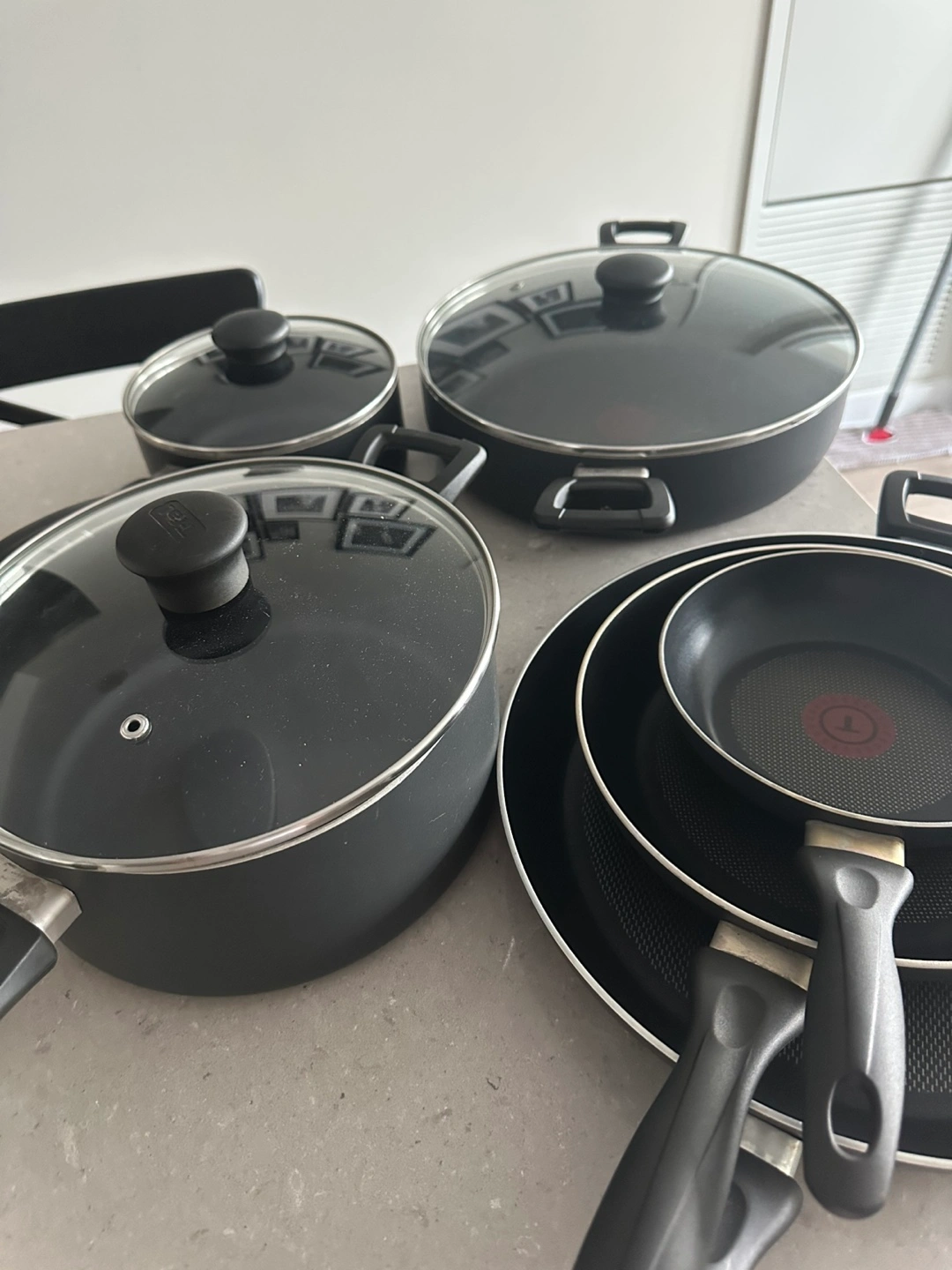 Pre-owned T-fal cookware set. Includes various sized pots and frying pans. All come with glass lids. Great for everyday cooking.