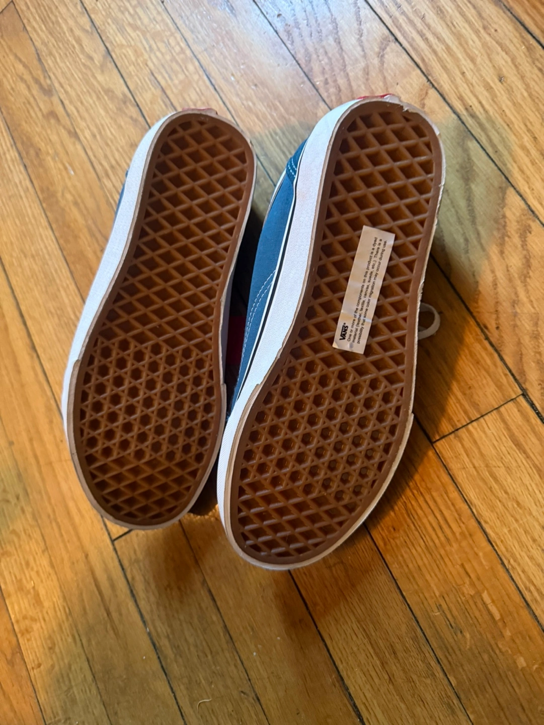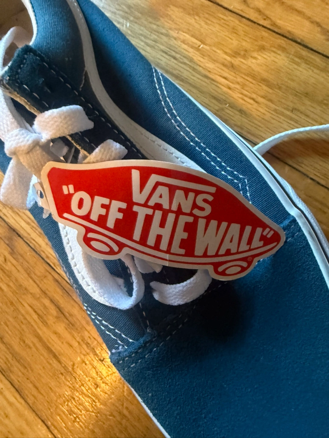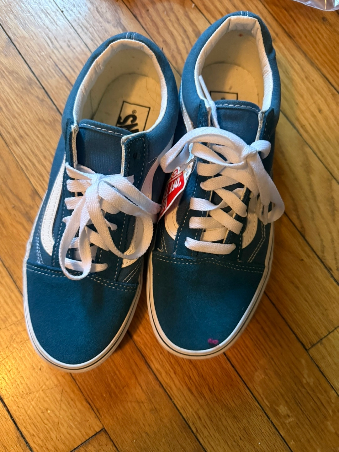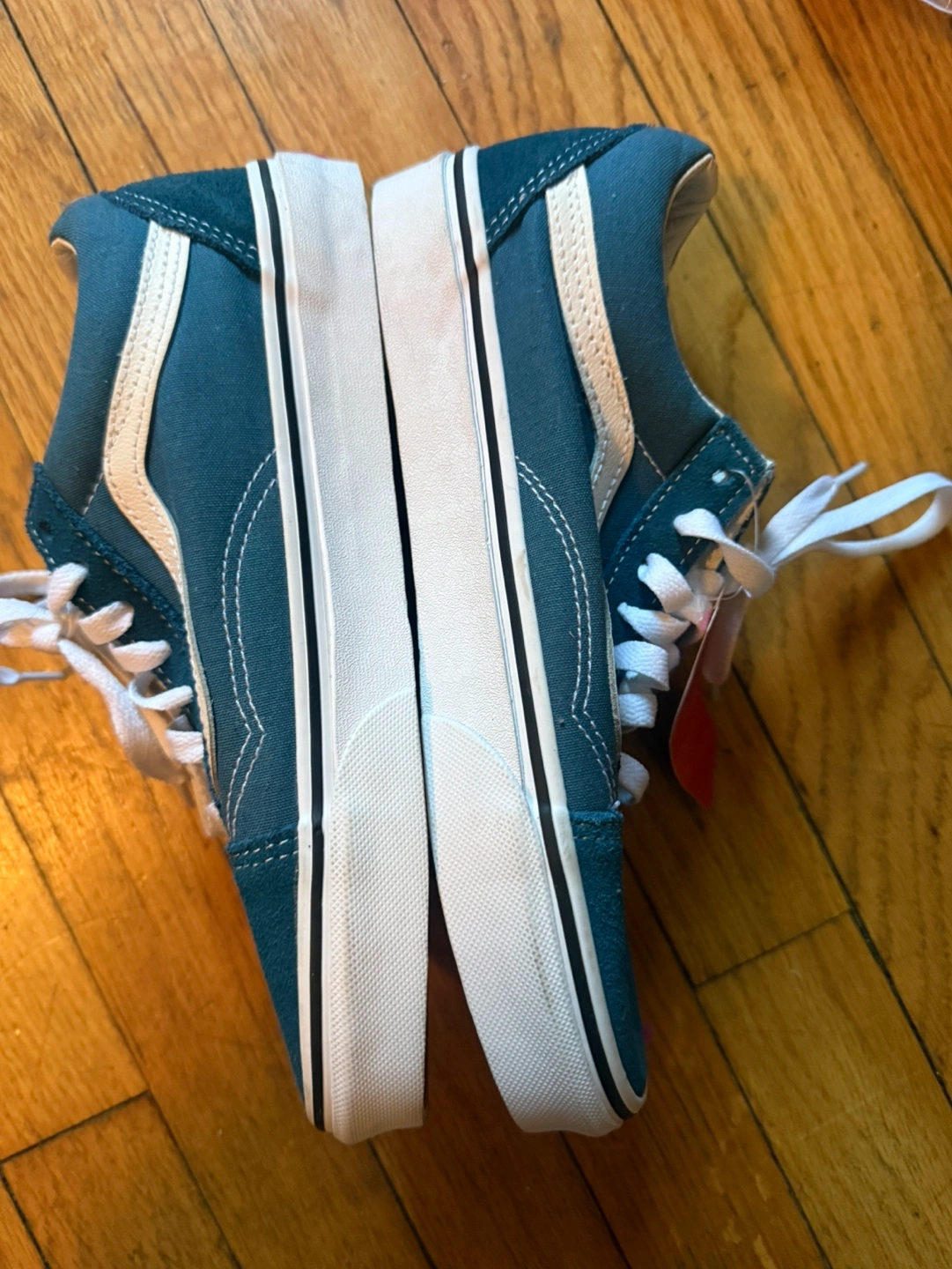 Brand new Vans Old Skool sneakers. Dark teal/blue canvas upper. White laces and side stripe. Classic Vans waffle sole. New with tags but no box.