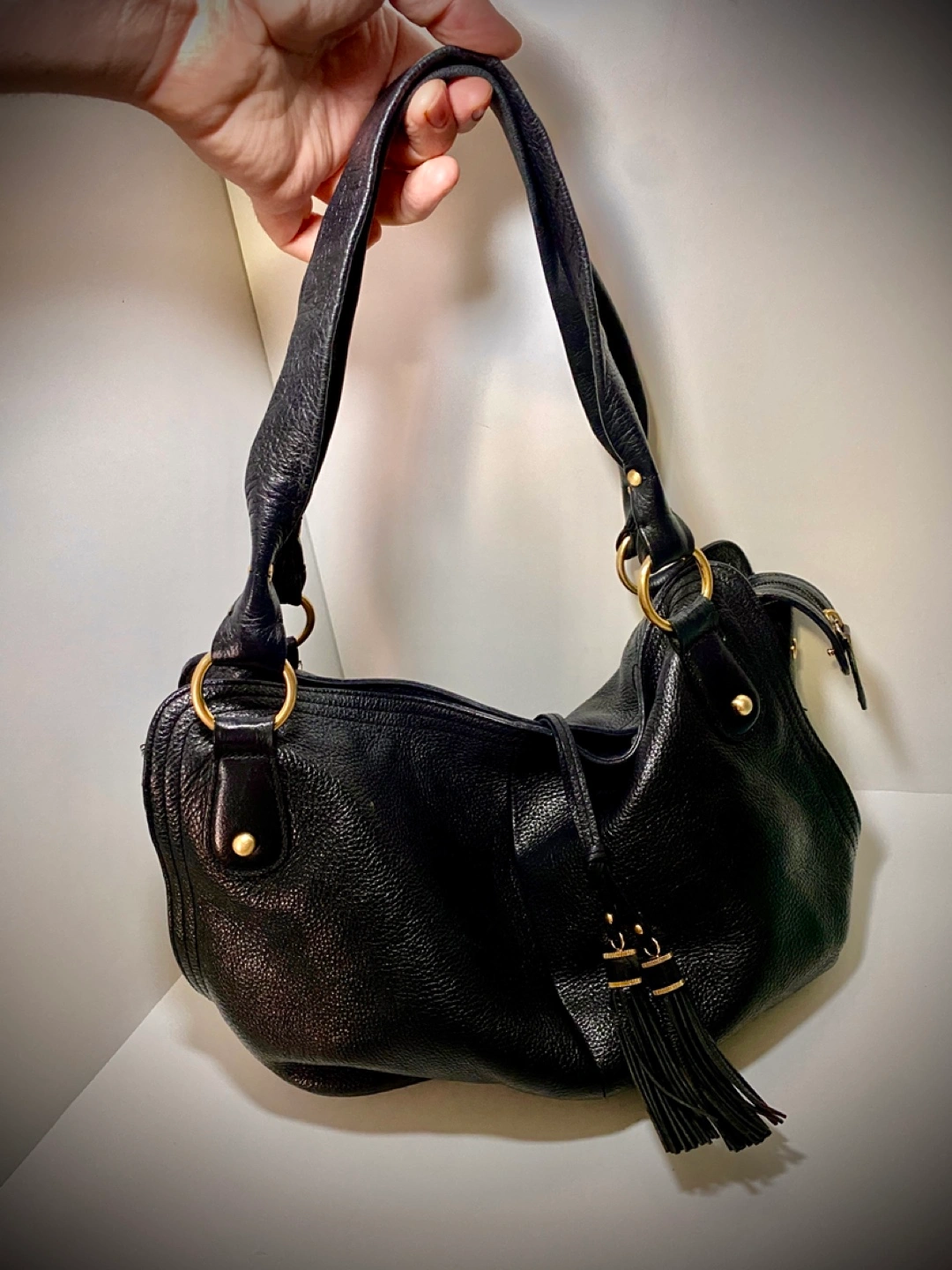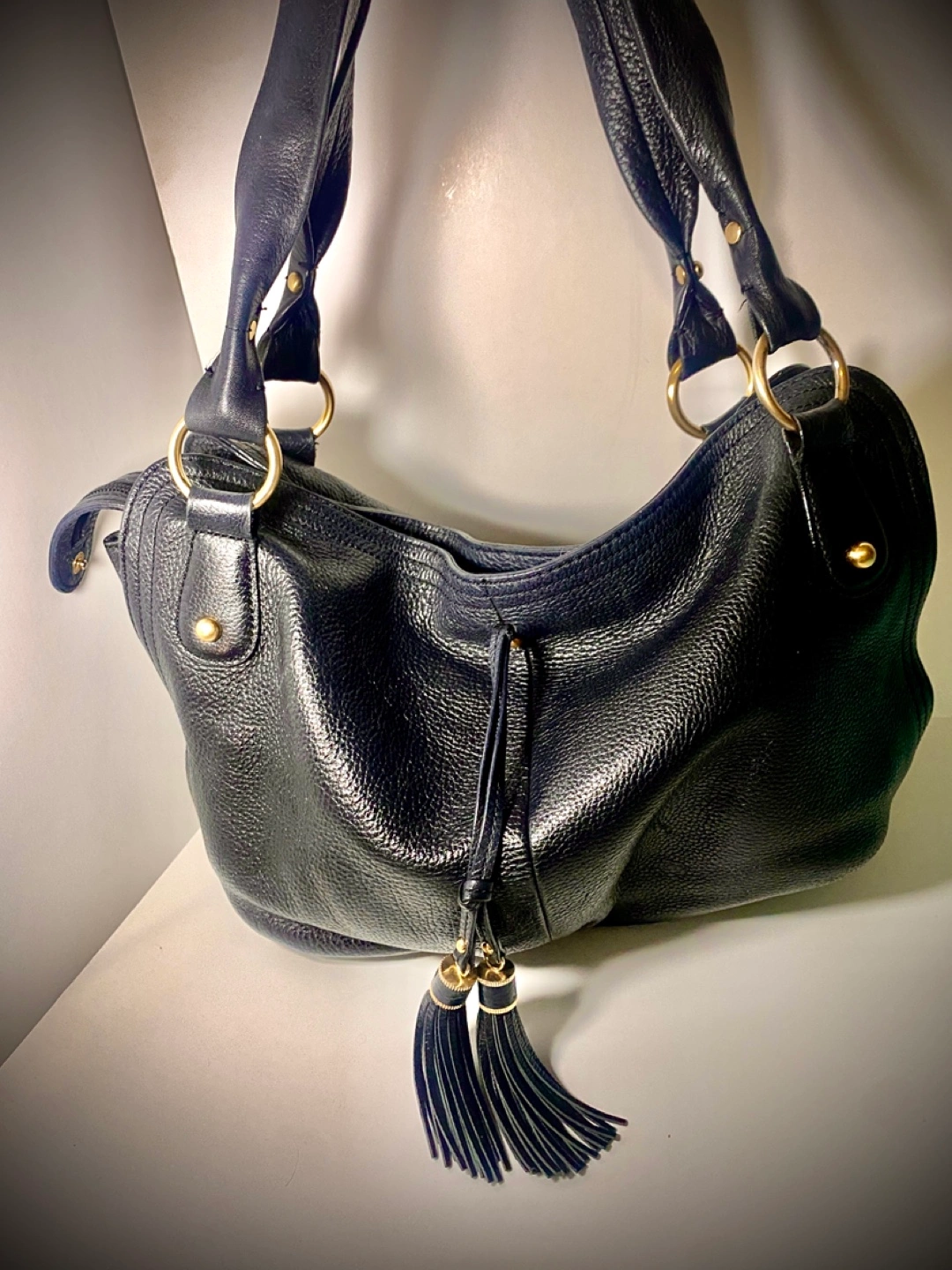 Black leather shoulder bag. Features gold-tone hardware. Drawstring closure with tassels. Interior zip pocket. Good pre-owned condition. Very well made! Pickup on Astoria Blvd South