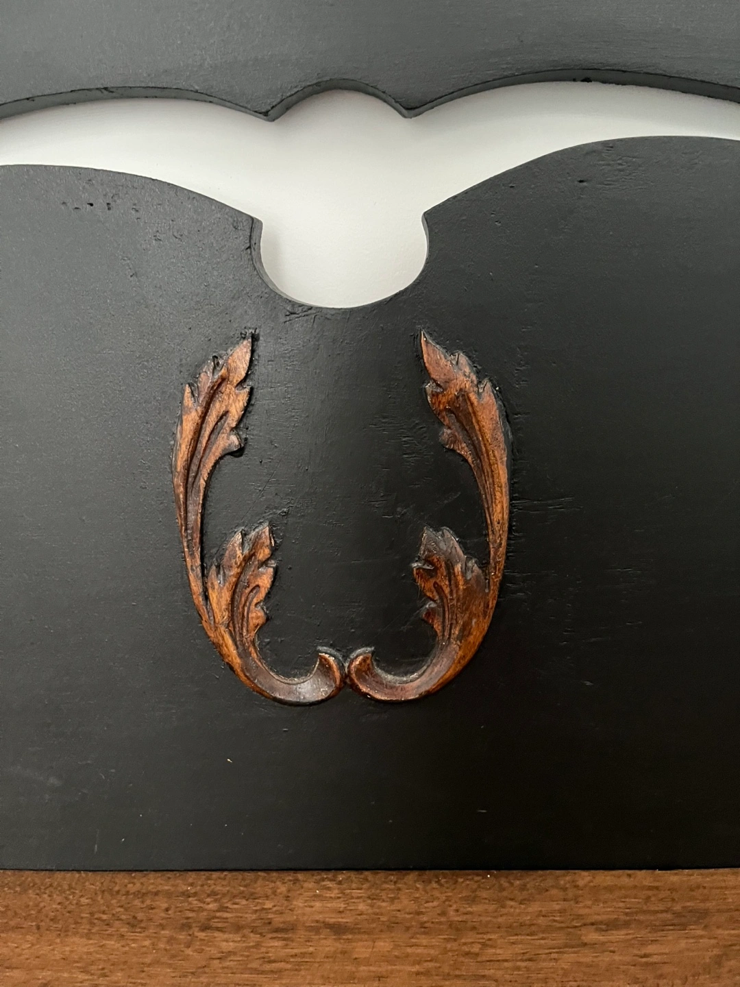 Refinished in a beautiful ebony finish with ornate details left in original wood