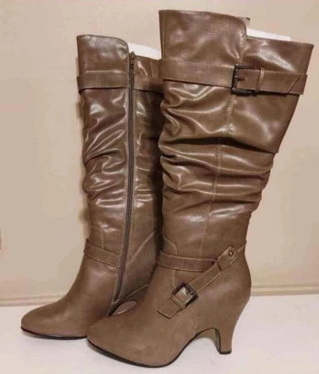 Pair of brown faux leather knee high boots. Features buckles and heels. Brand new, never worn.