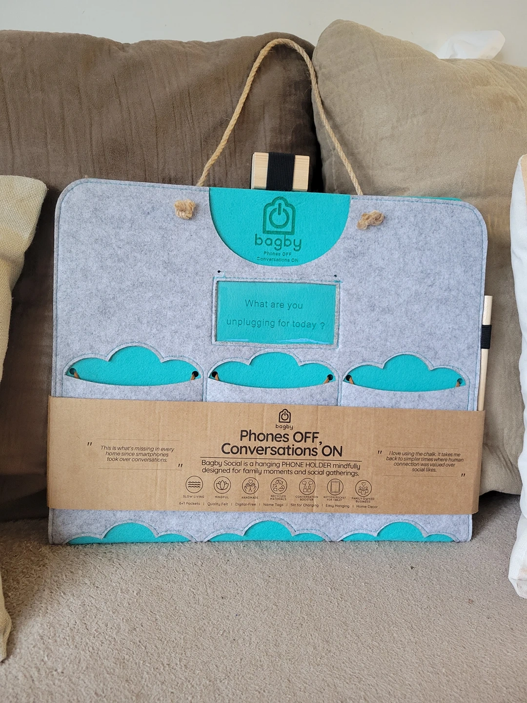 It can be hung anywhere. Comes with Chalk pencil & eraser. All pockets have mini chalkboards to personalize each pocket when in use. Promotes unplugging and spending quality time together.