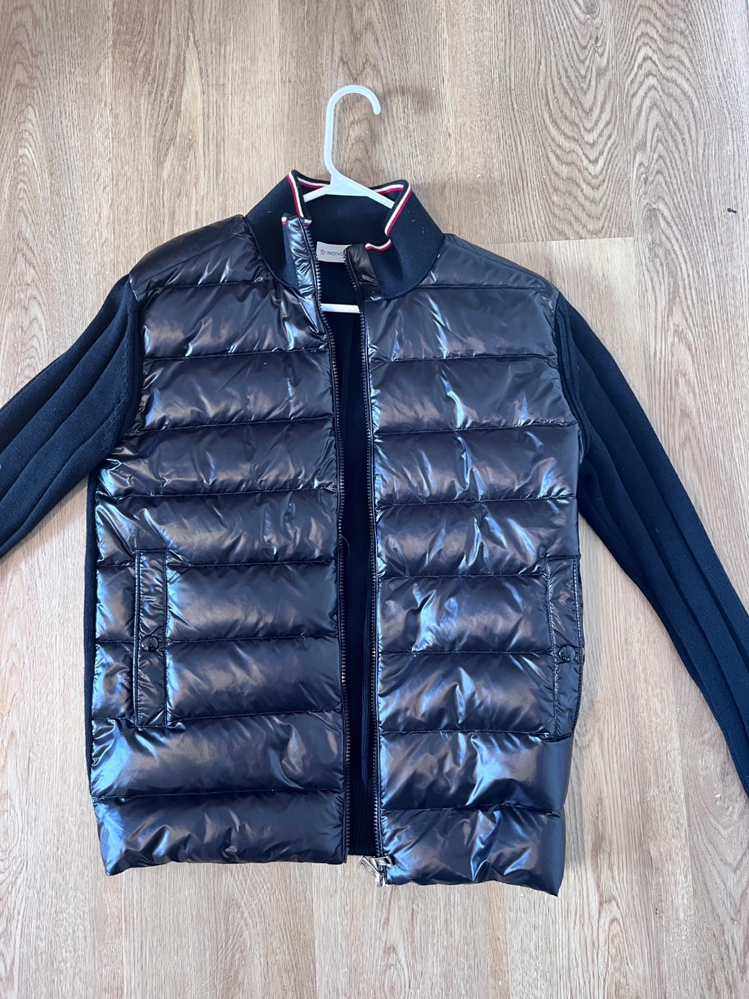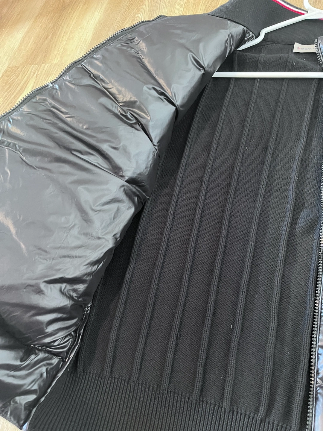 Black puffer jacket. Features a ribbed knit body and sleeves. Zip front closure. Two front pockets. Excellent condition. Also got it from my brother he said it’s quite expensive Liz