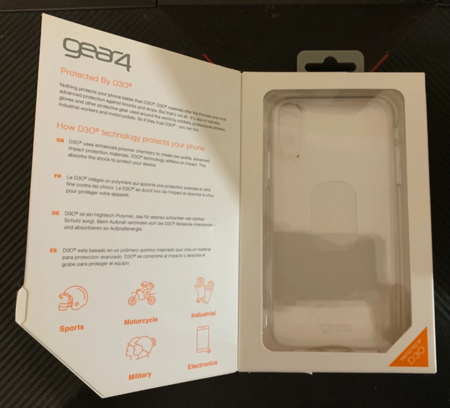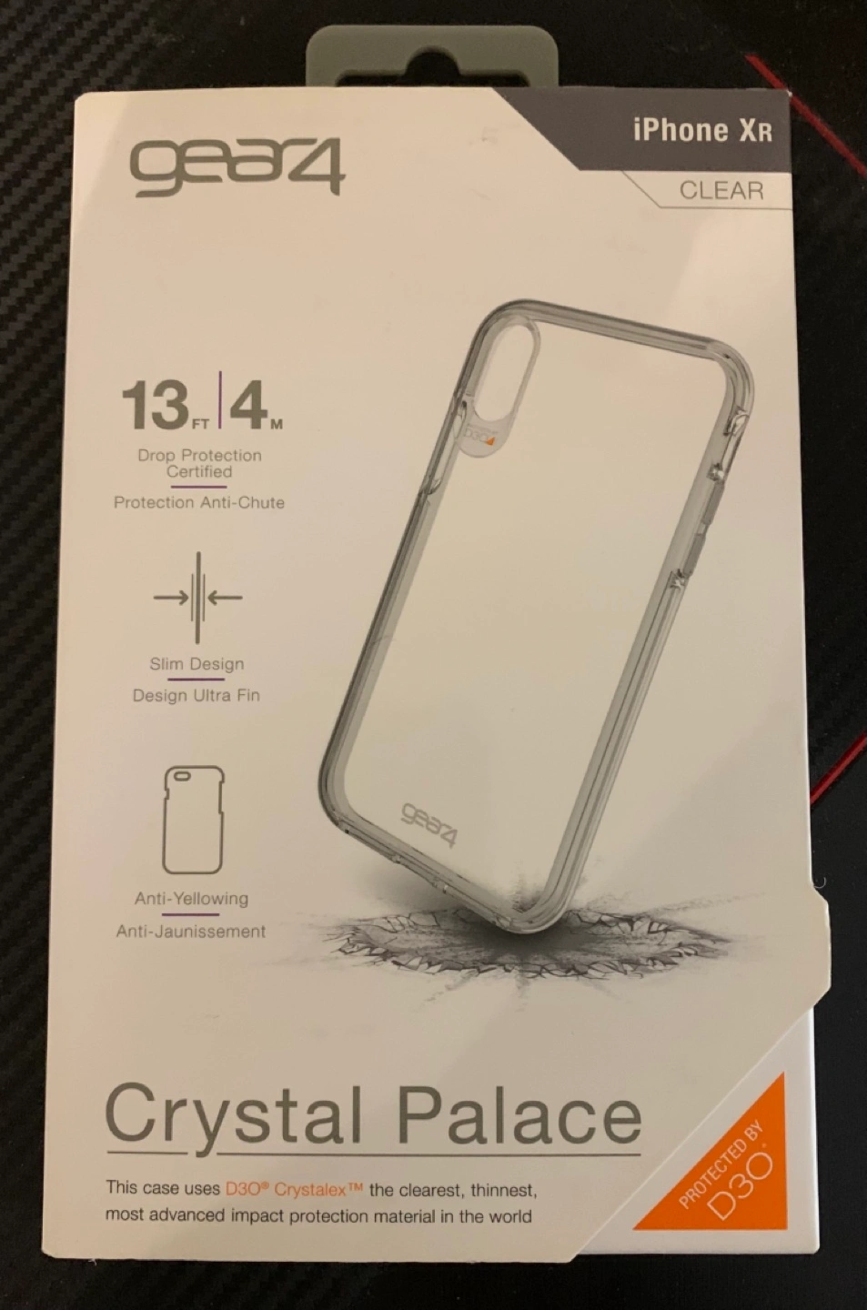 Brand new in box. GEAR4 Crystal Palace case for iPhone XR. Clear, slim design. Wireless charging compatible. Drop protection certified. D3O impact protection material. Includes lifetime warranty.