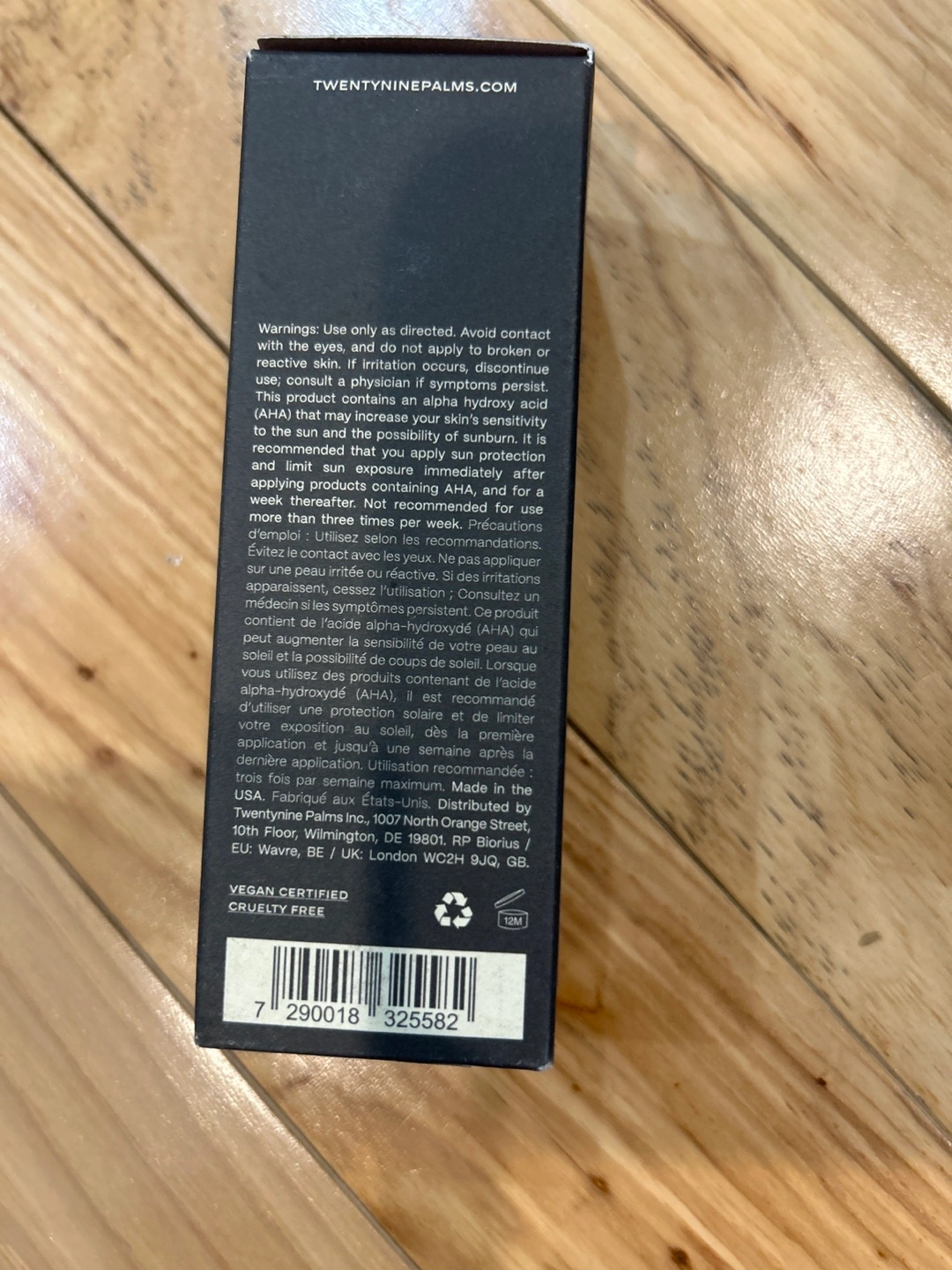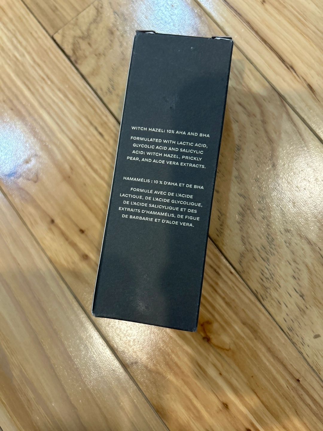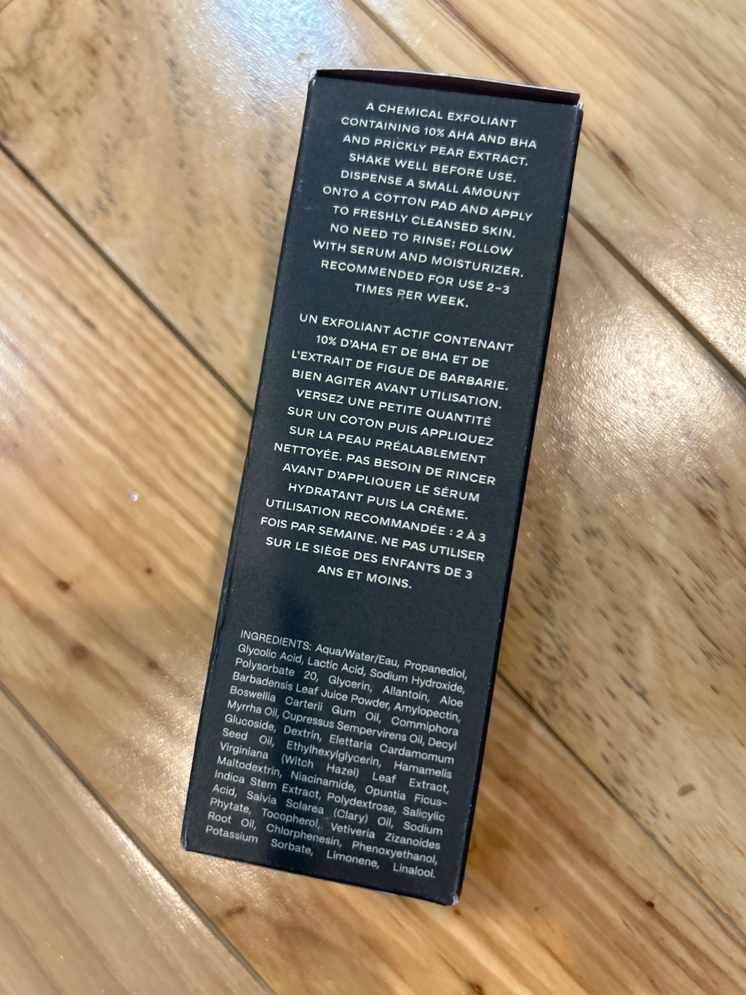 Chemical exfoliant. Contains 10% AHA and BHA. Witch Hazel, prickly pear, and aloe vera extracts. 3.4 fl oz / 100 mL. Vegan and cruelty-free.☺️👍