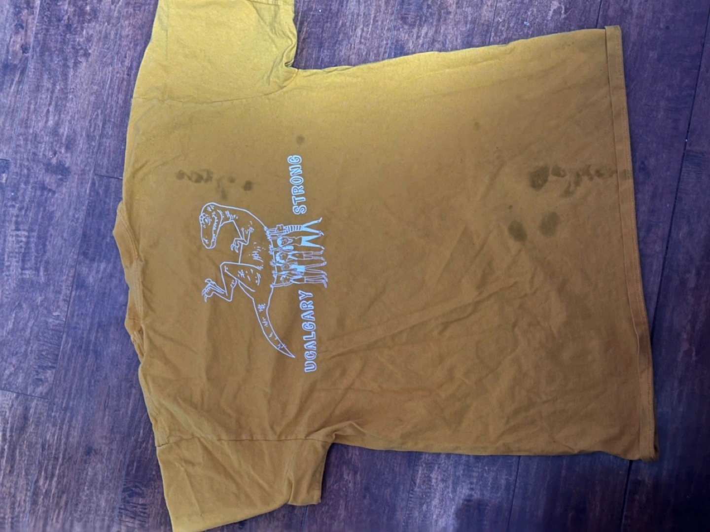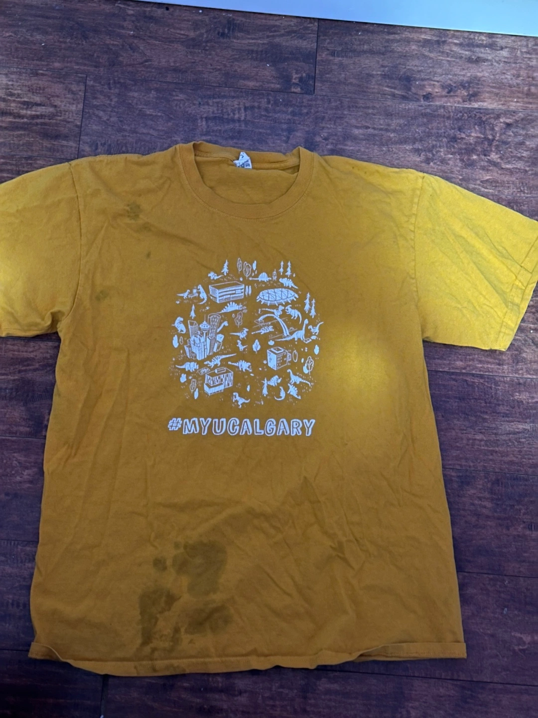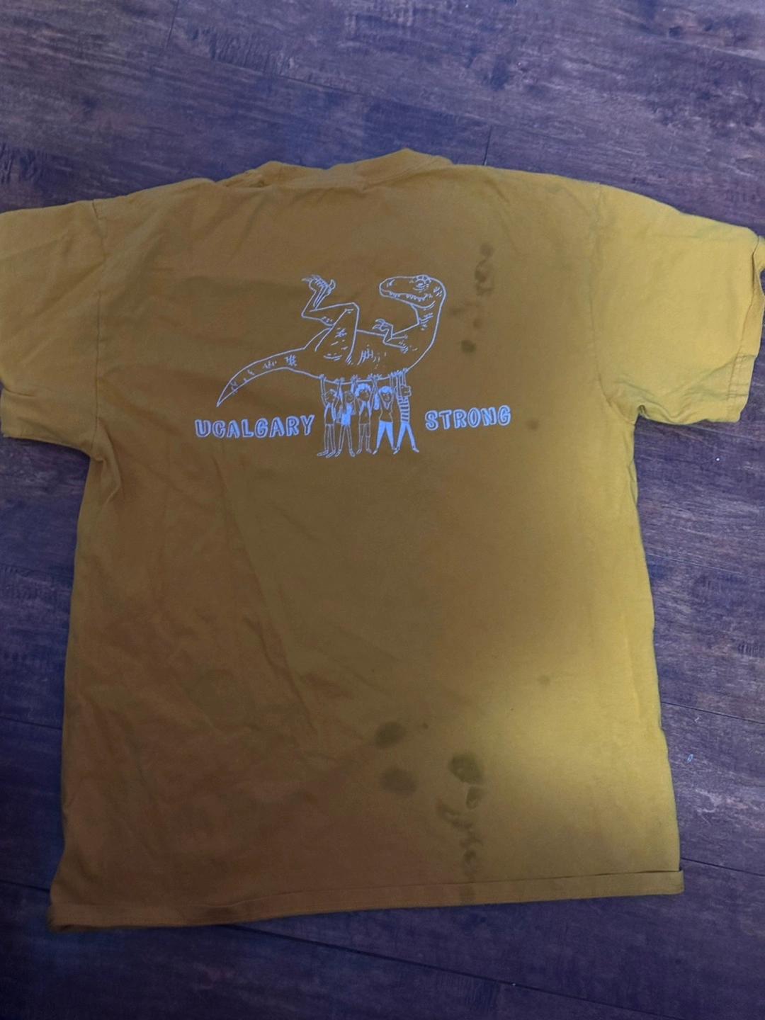 Mustard yellow t-shirt. Features dinosaur graphic and #MyUCalgary text on the front. Back features a dinosaur carrying people with 'UCalgary Strong' text. Shows signs of wear.