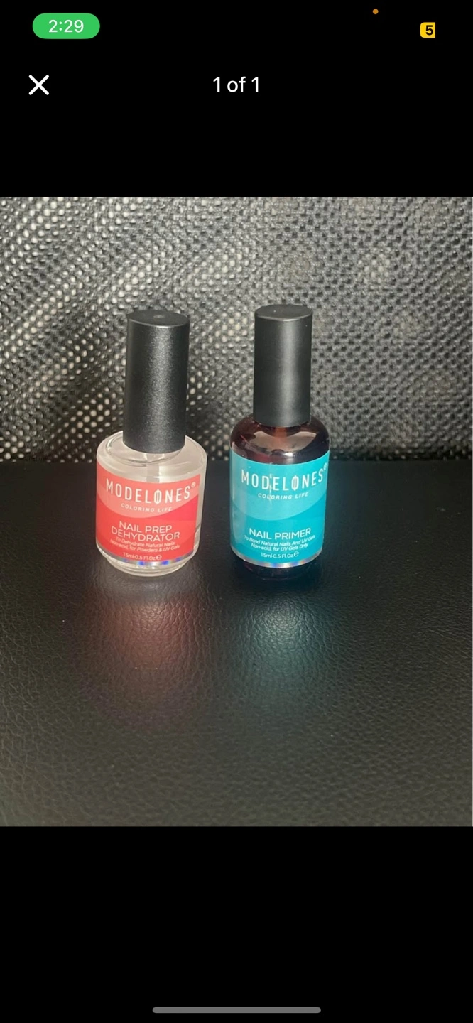 Two bottles of Modelones nail products. One is a nail prep dehydrator and the other is a nail primer. Both are 15ml/0.5 fl oz. Amazing for nail prep/long lasting nails. Brand new. Name brand