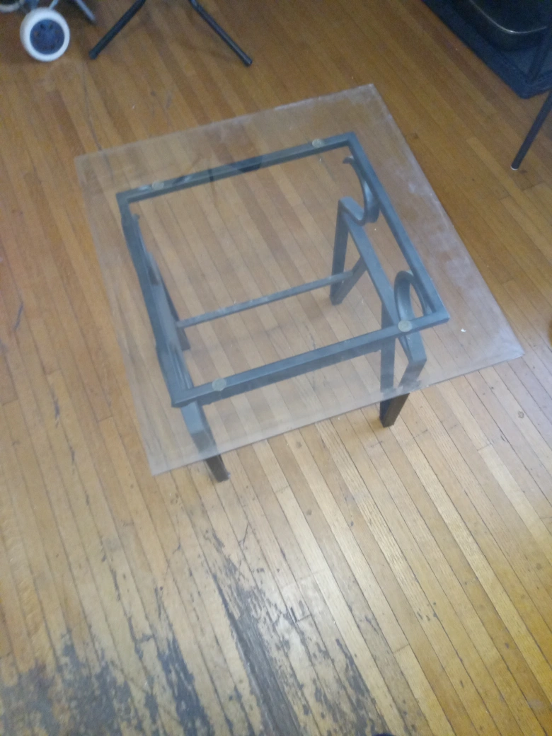 Modern coffee table. Glass top and black metal frame. Simple design. comes with 2 matching end tables. Some minor wear.