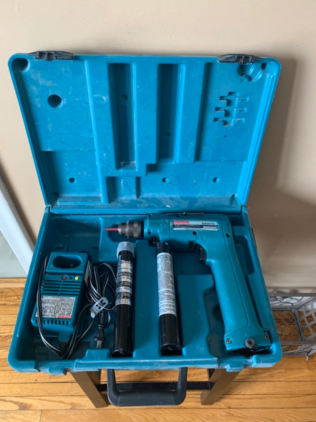 Vintage Makita cordless hammer drill. Includes drill, three 9.6 volt Ni-Cd batteries, Chuck key and charger. All in a Makita carrying case. Batteries took a charge and drill runs but battery health is unknown.