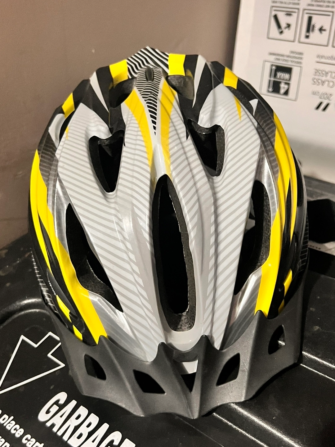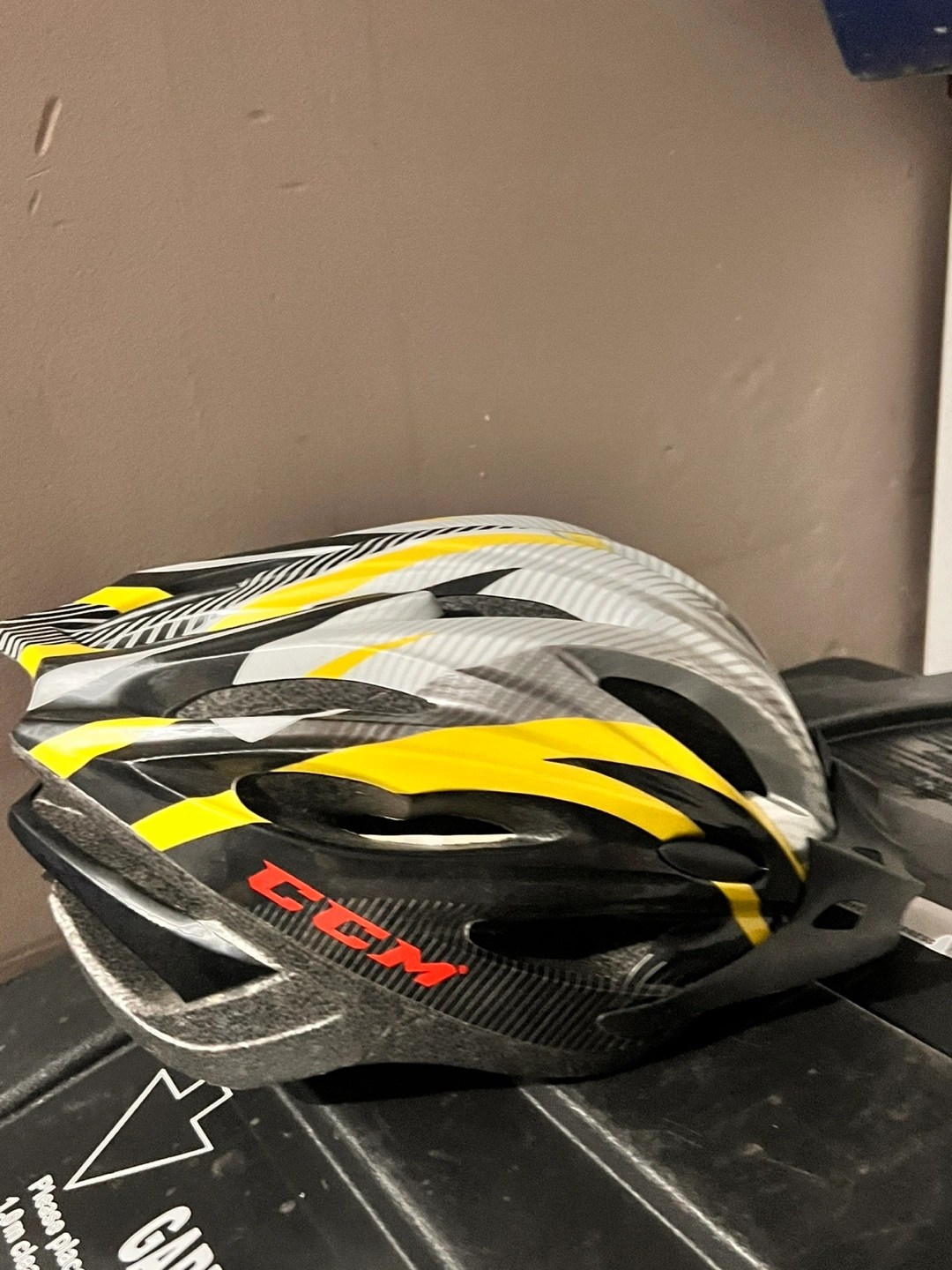 Adult sized bicycle helmet. Grey, black and yellow colour scheme. Good condition. Adjustable straps. And kids helmet also available each for $20