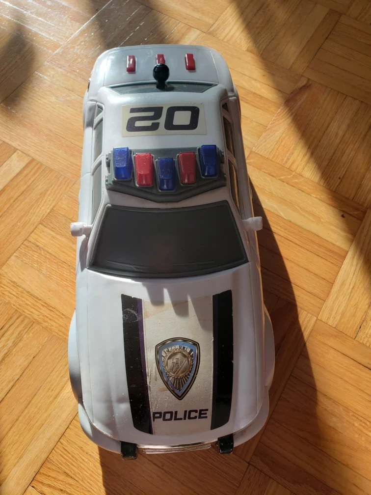 White police car toy. Number 02 on the roof. Features flashing lights and sounds. Suitable for young children. Pre-owned.