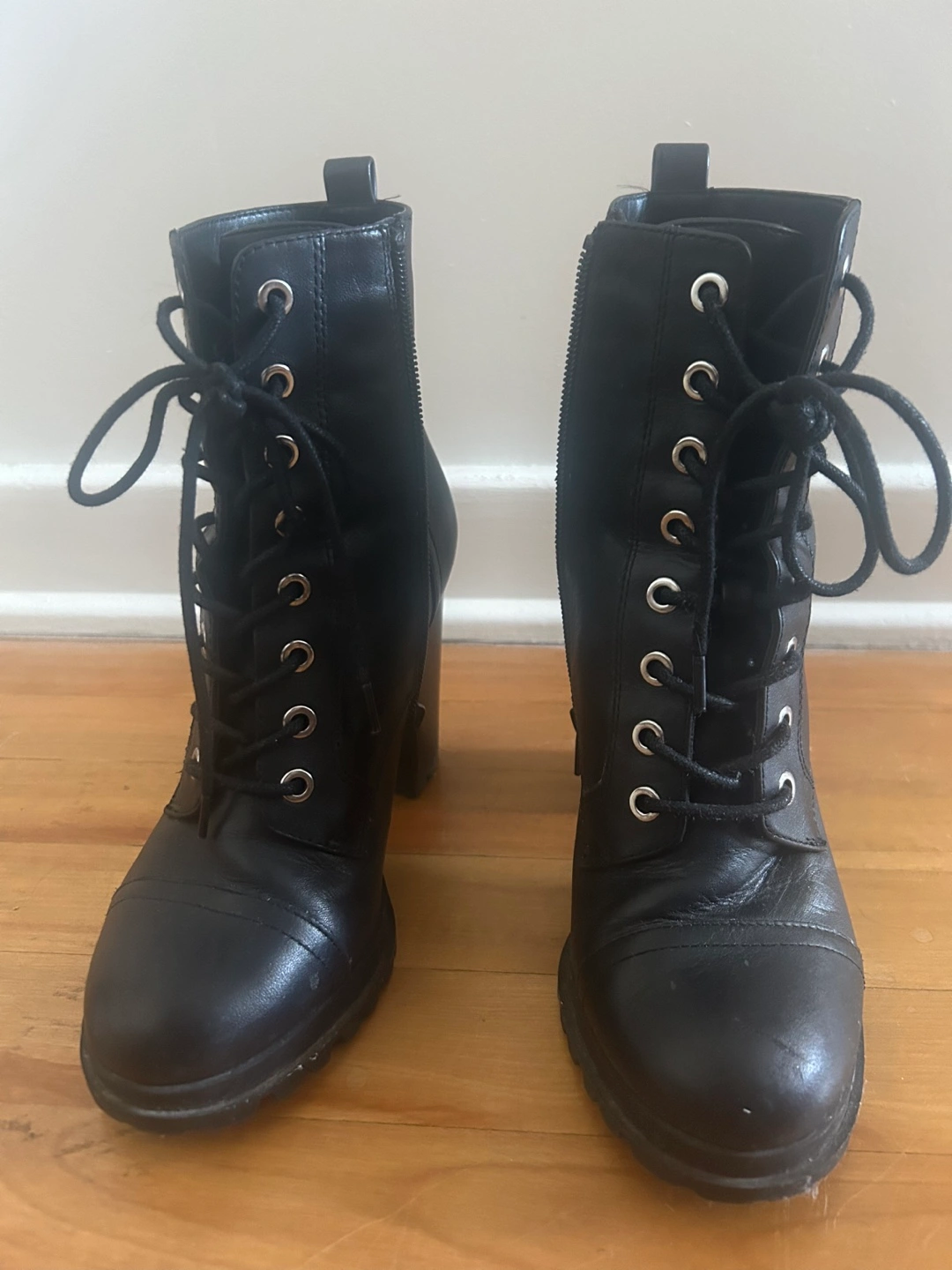 Stylish black ankle boots. Lace-up front and side zipper. Block heel. Great for fall and winter.