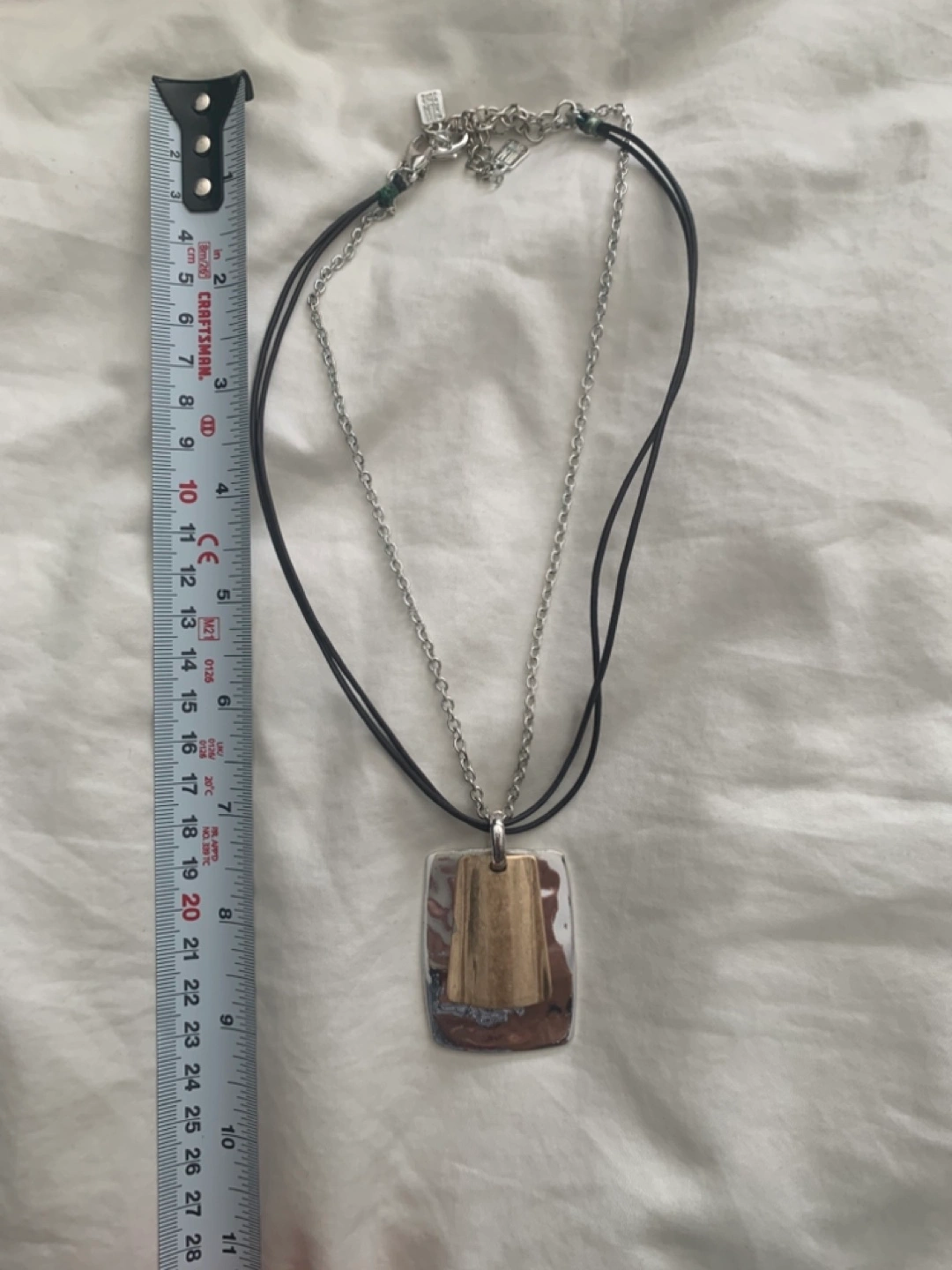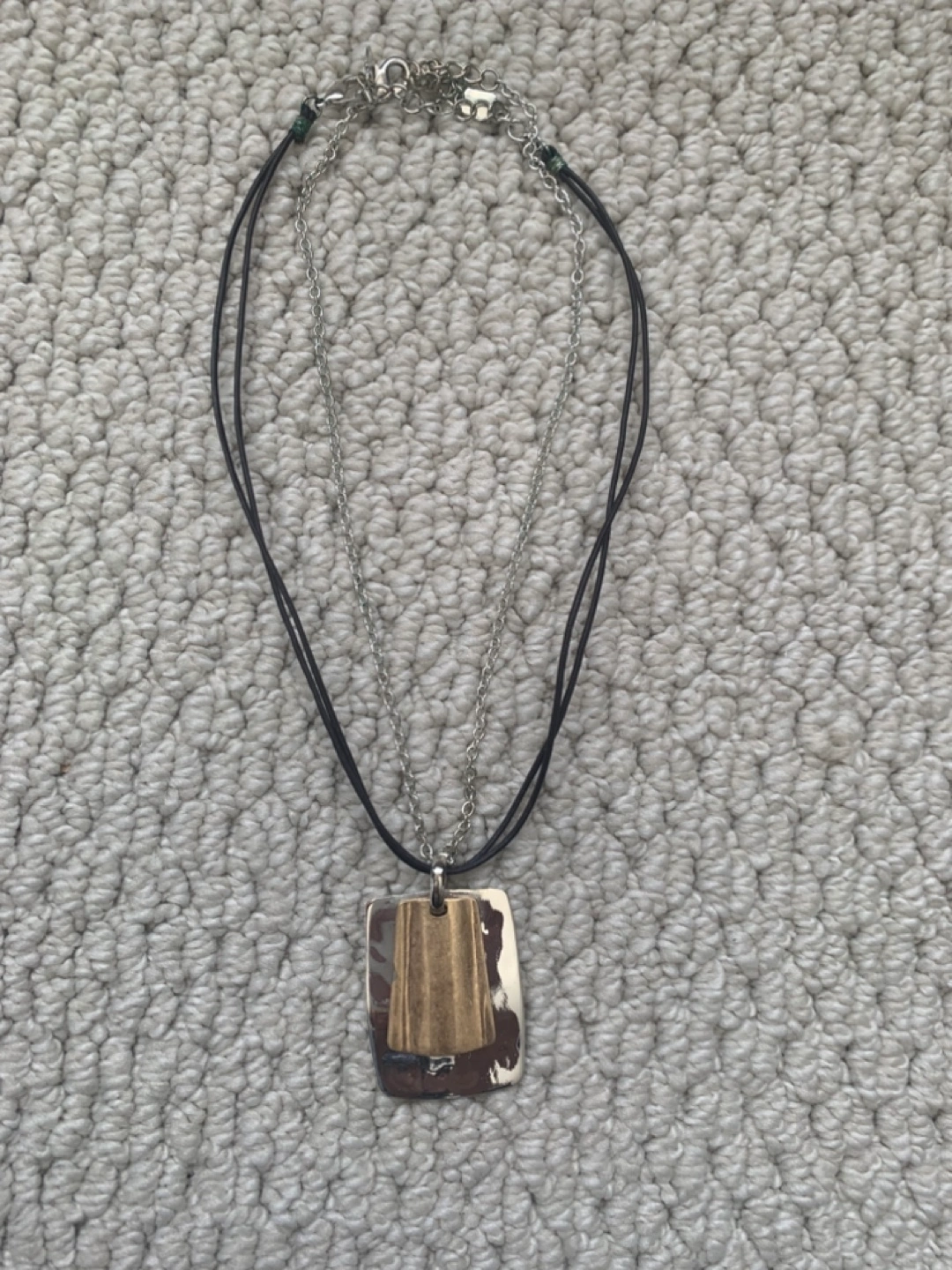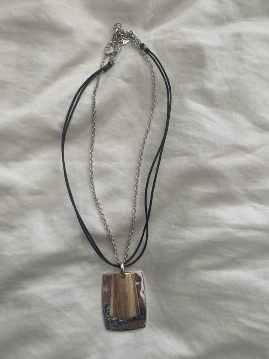 Two-layered necklace. Features a silver chain and brown cord. Pendant is rectangular with a gold-toned accent. Unique design.