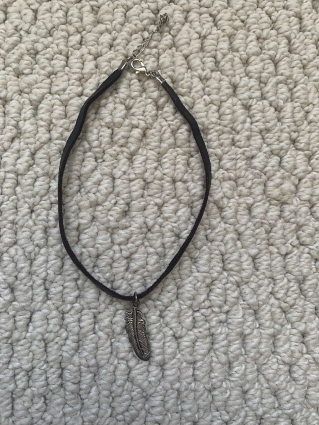 Simple brown leather choker necklace. Features a small silver feather pendant. Adjustable length. Great layering piece.
