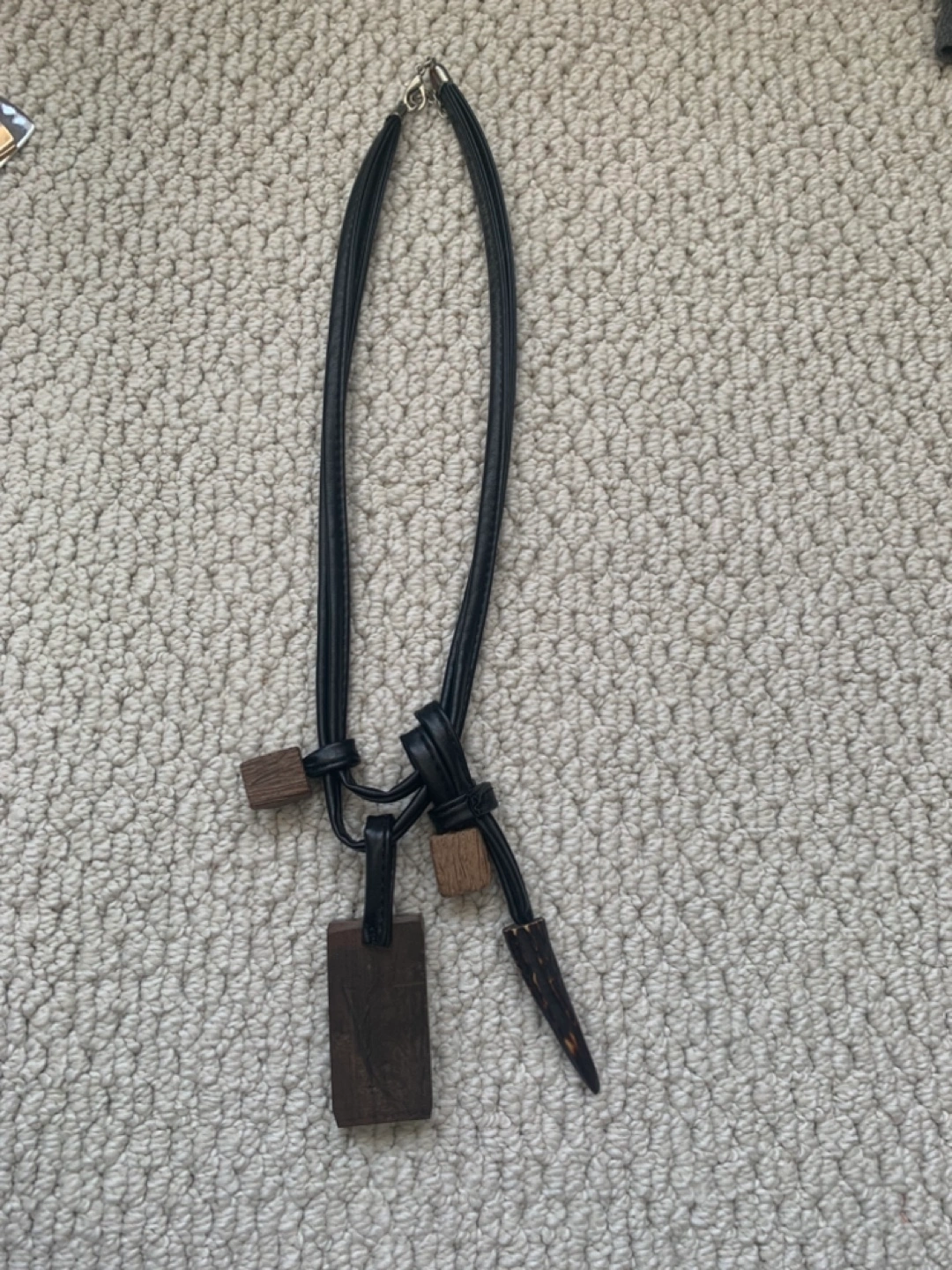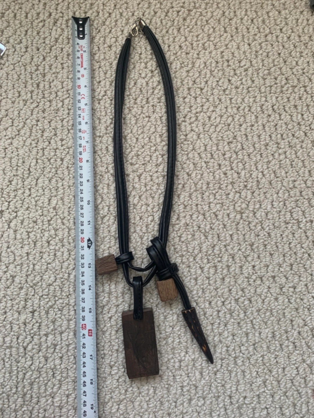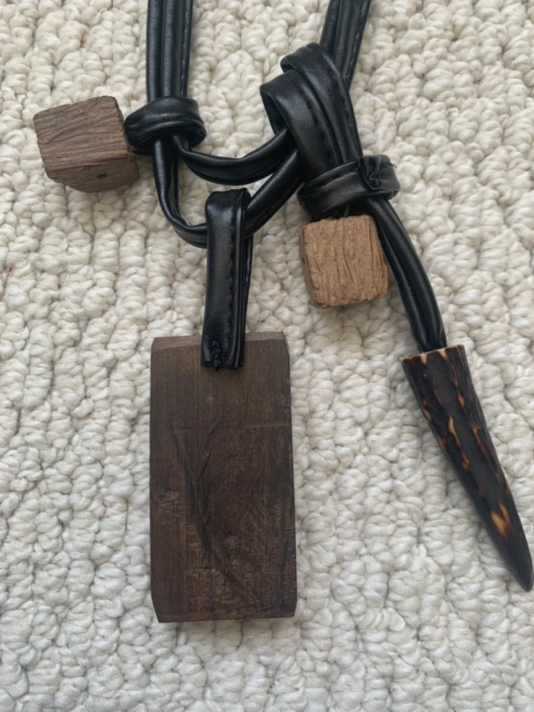 Layered black leather cord necklace. Features three wooden charms and one antler charm. Bohemian style.