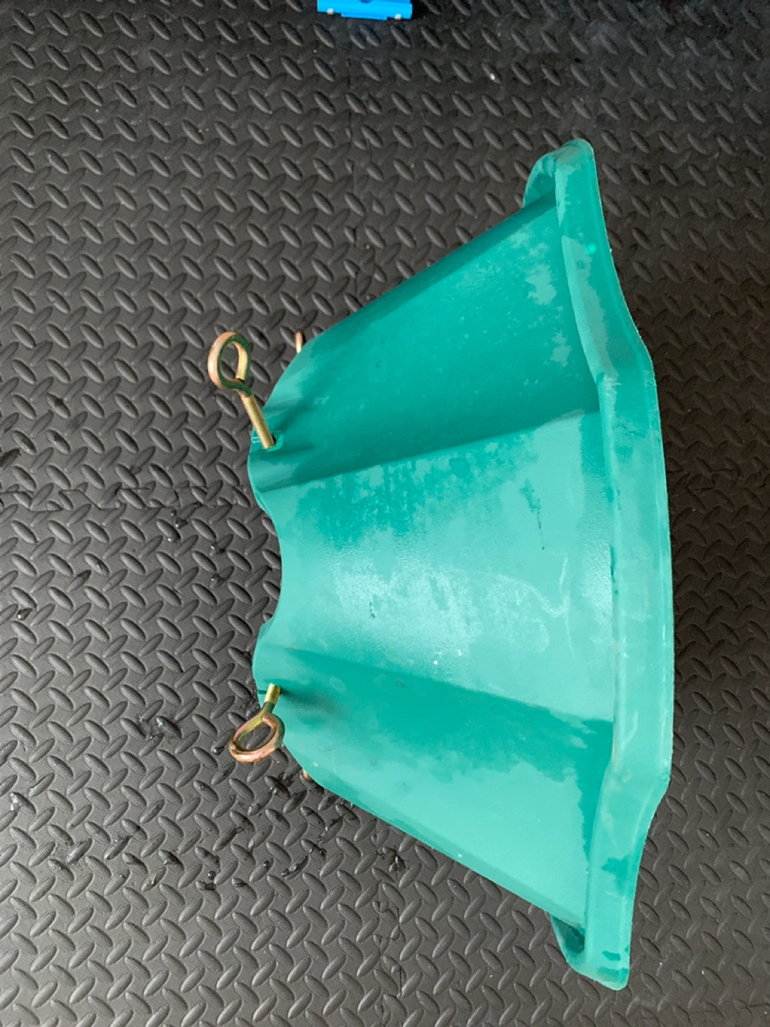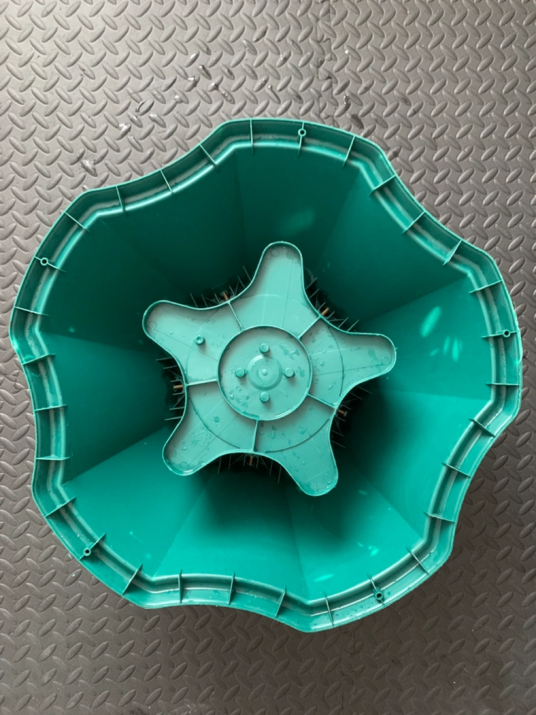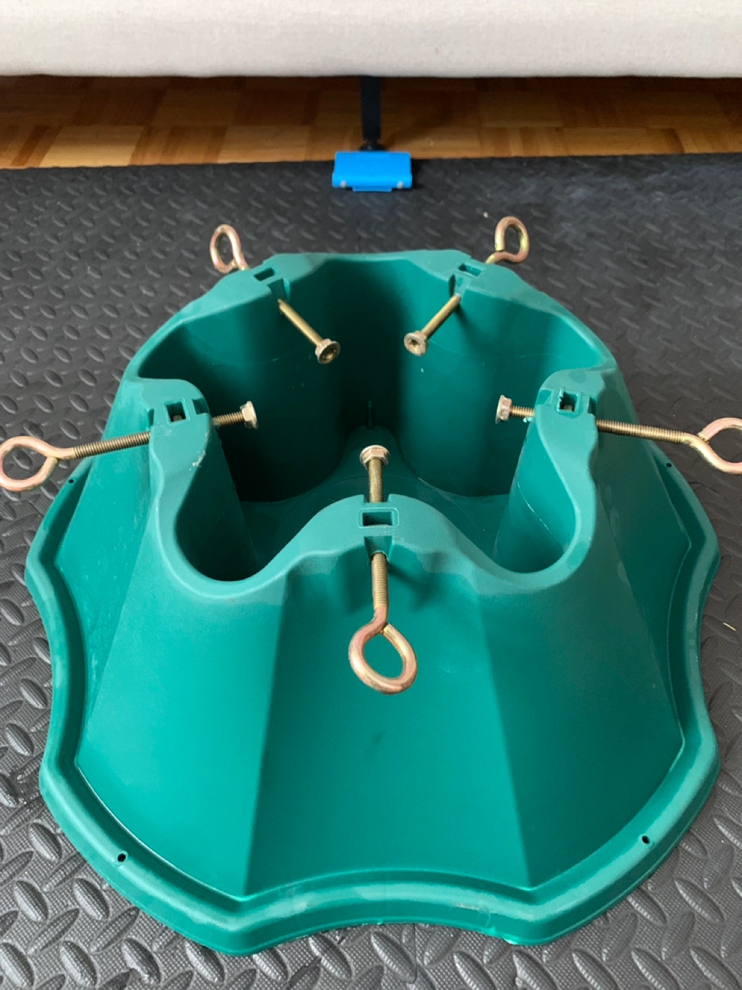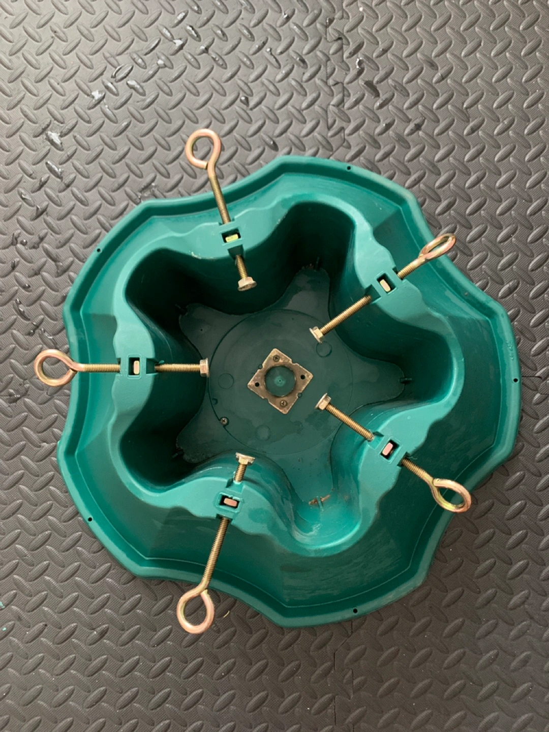 Large green plastic Christmas tree stand. Five-point star base. Includes screws and metal loops for securing tree. Durable plastic construction. Ideal for larger artificial trees.