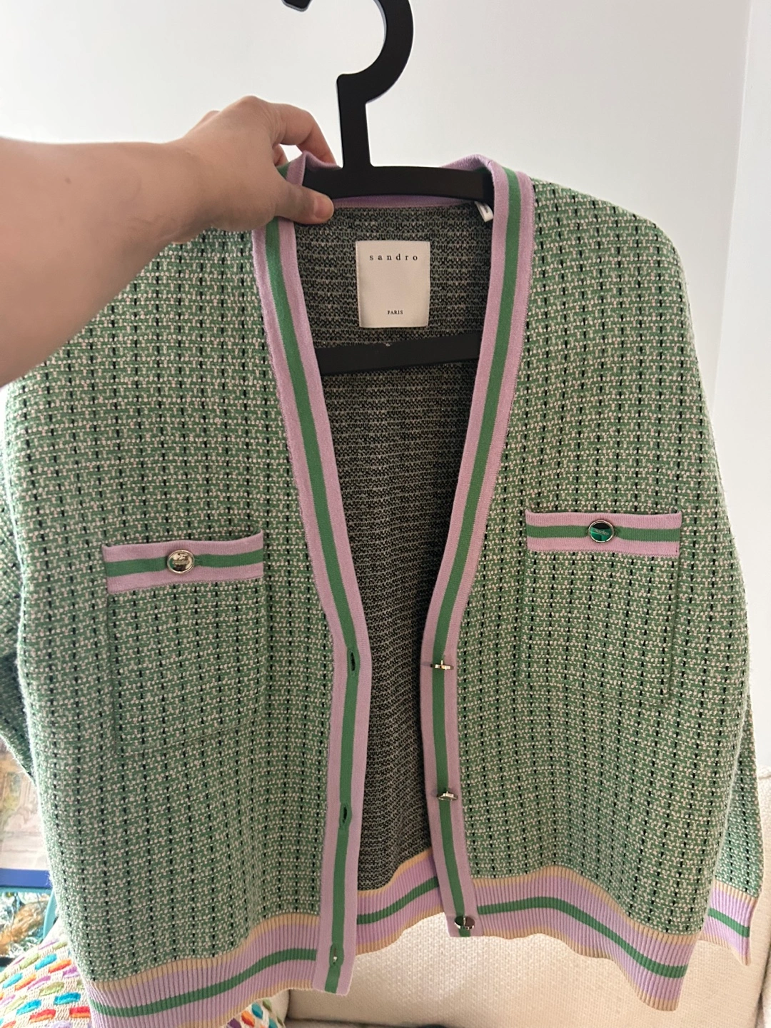 Buy & SellSandro Paris Green Tweed CardiganSandro Paris Green Tweed Cardigan$90Beautiful pastel green tweed cardigan. Features two pockets and pastel purple and green stripes along the hem and placket. Button closure.ConditionLike newSize3BrandSandro1 chats·3 favorites·45 viewsSELLERJiyaDavisville Village343 reviewsWHERE TO MEETNear structube