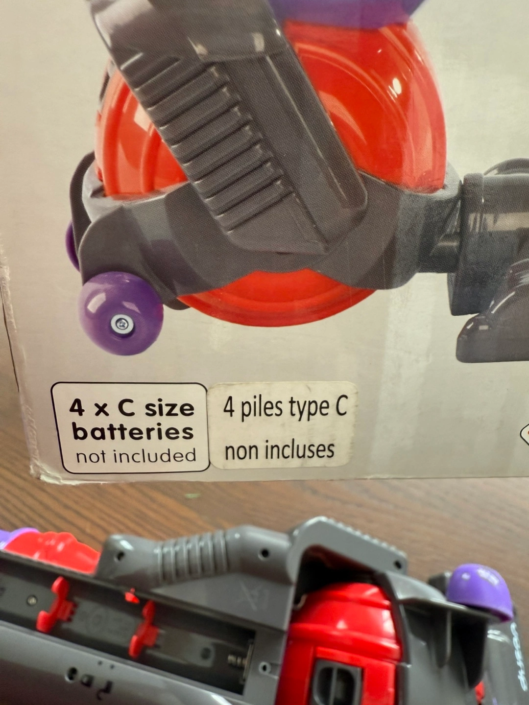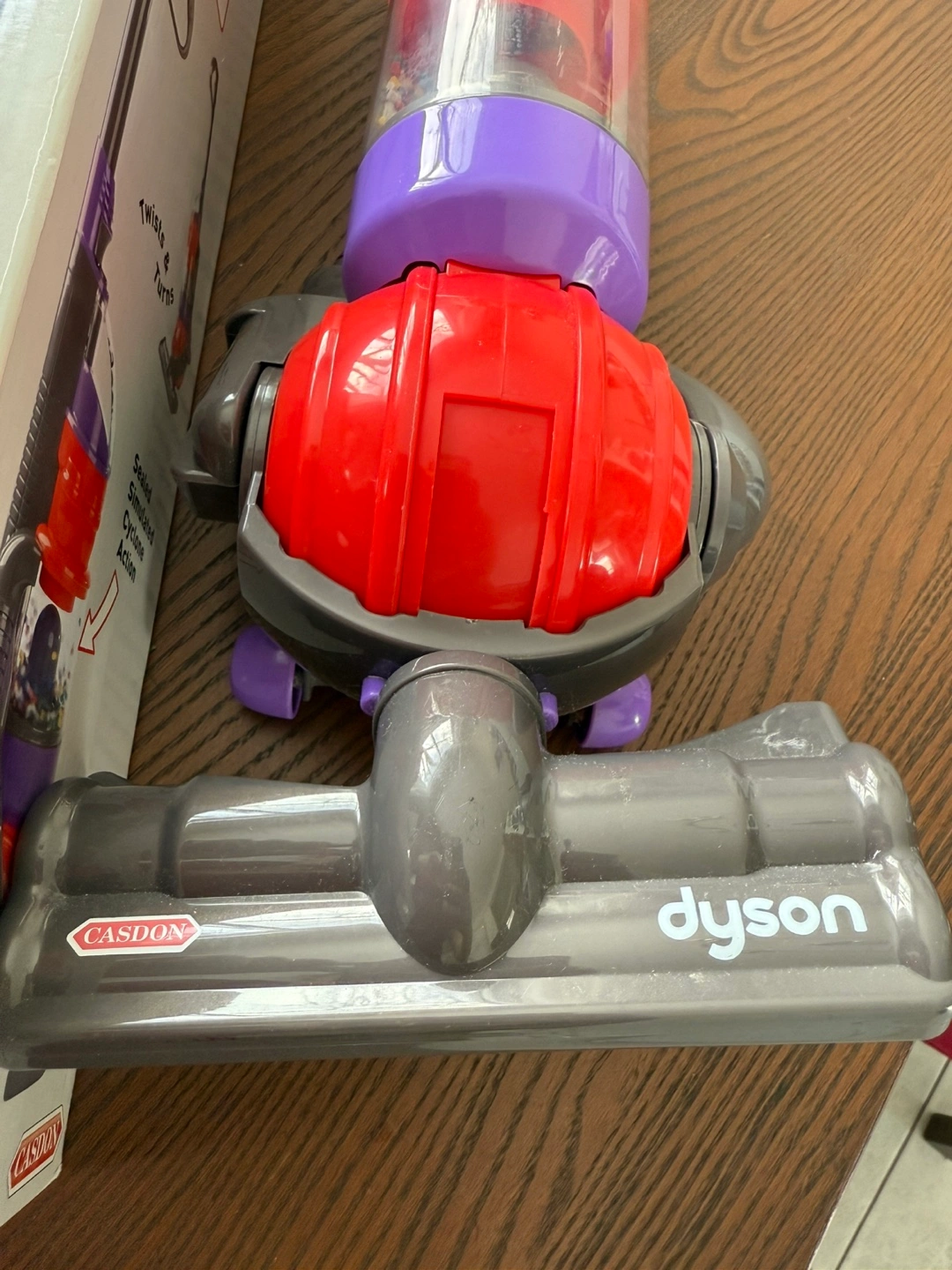 Kids' toy vacuum cleaner. Red and purple. Dyson-styled.