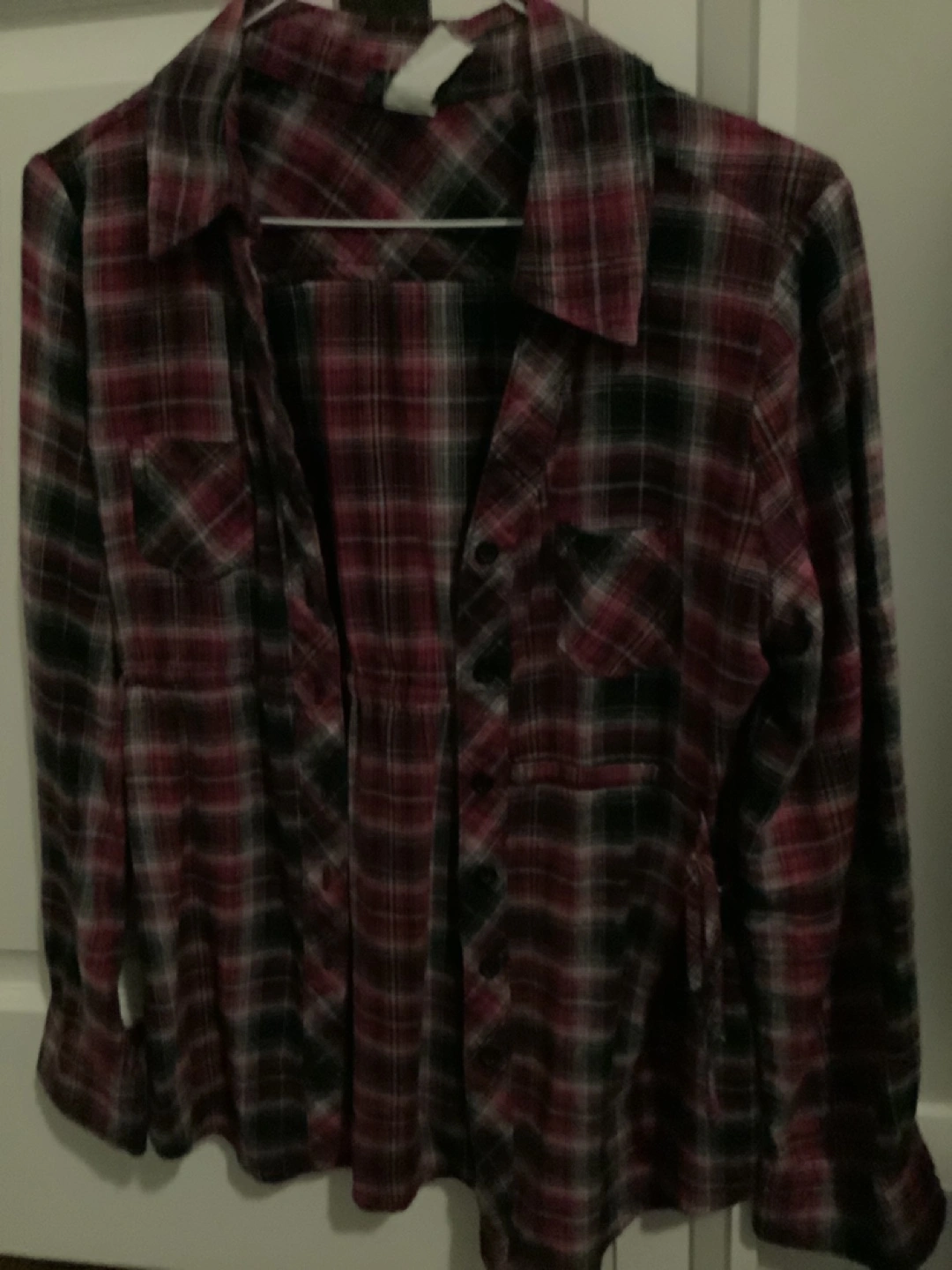 Long-sleeved button-up shirt. Features a classic plaid pattern in shades of red, black, and grey. Chest pockets. Soft material.