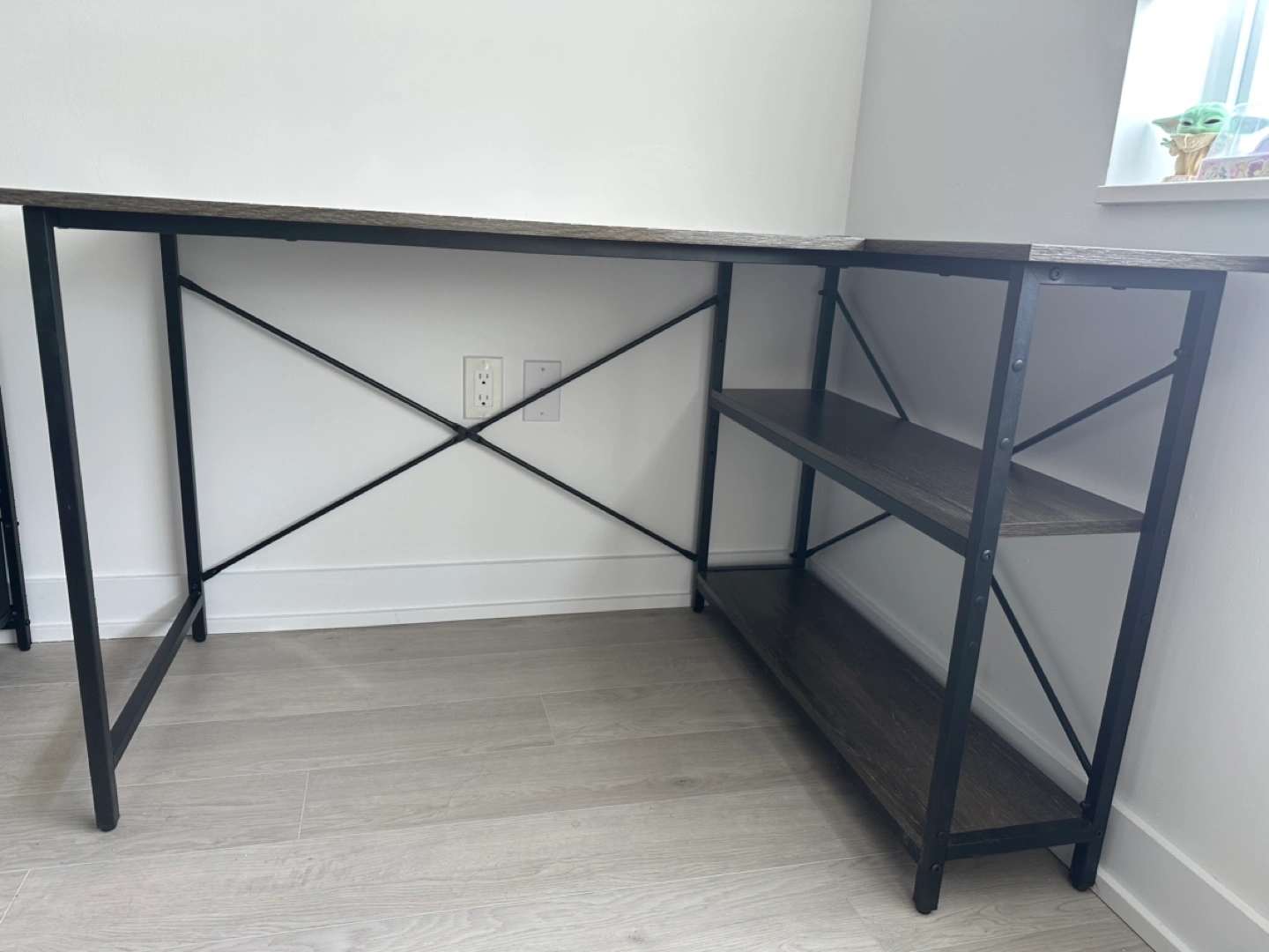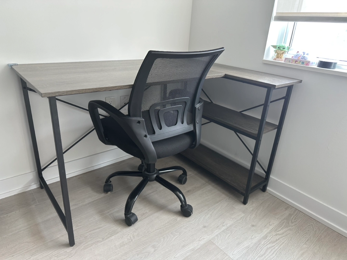 170L-shaped computer desk. Grey wood, black metal frame. Two shelves for storage. Minimalist design, great for home office. With chair +$30 π Pick up near Eglinton Station. Cash only, thank you!