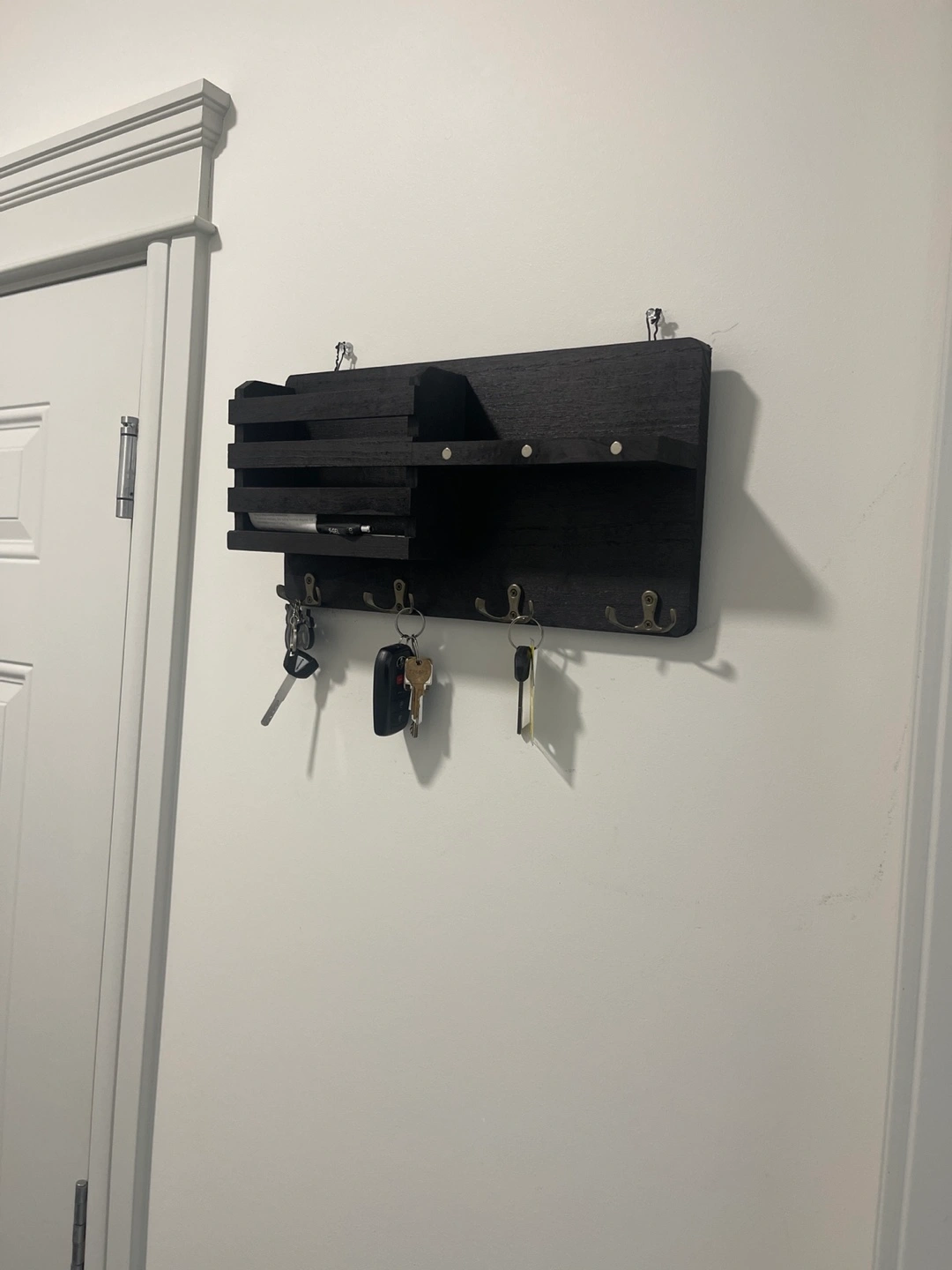 Dark stained wood key holder. Features multiple hooks, a small shelf, and a mail slot. Perfect for entryway organization.