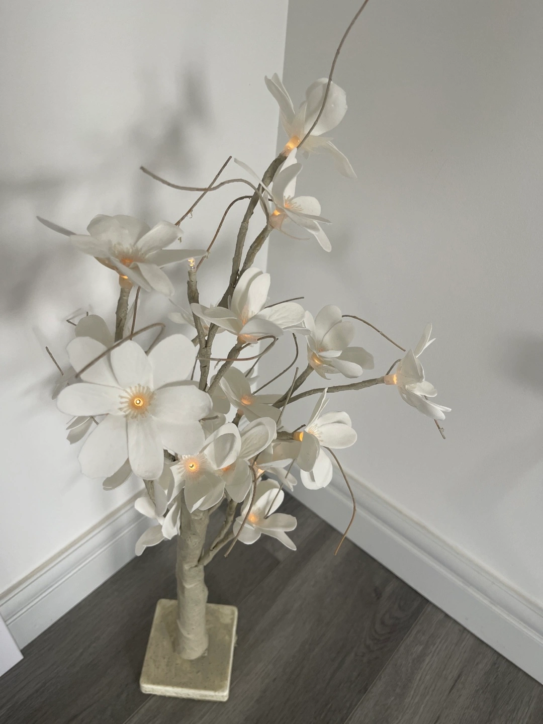 Beautiful artificial blossom tree. Features white flowers and warm white LED lights. Perfect for home decor. Stands on a square base. AA Battery operated.