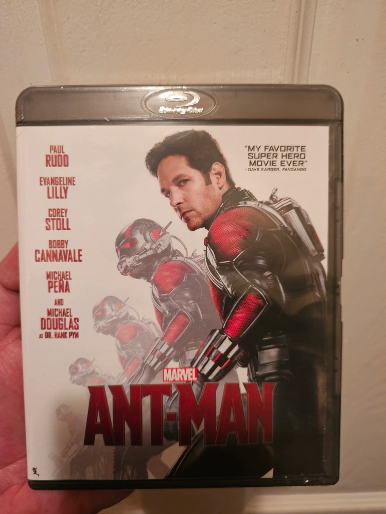 Marvel's Ant-Man Blu-ray. Features Paul Rudd, Evangeline Lilly, Corey Stoll, Bobby Cannavale, Michael Peña, and Michael Douglas.