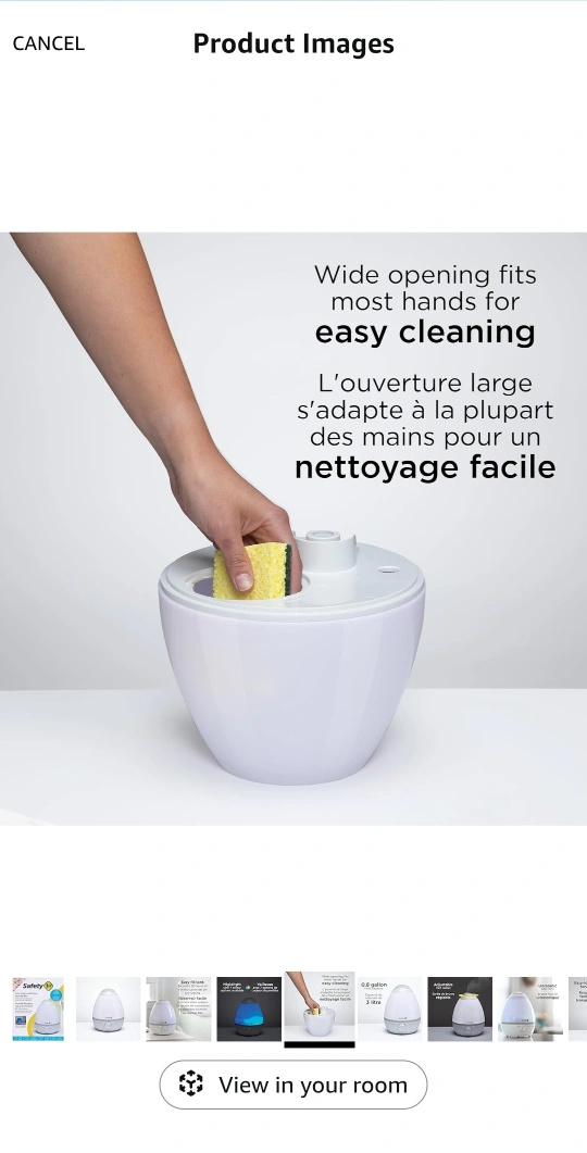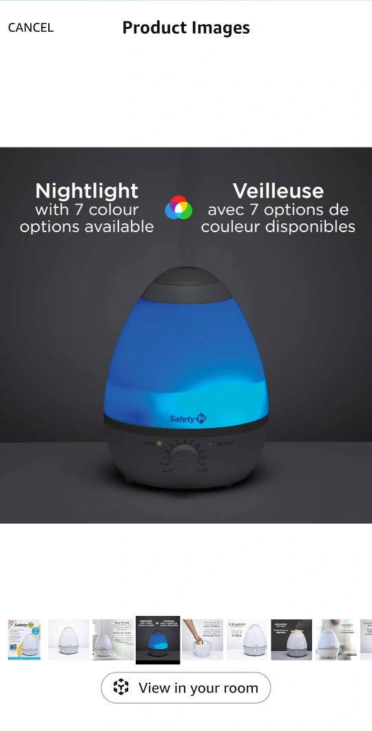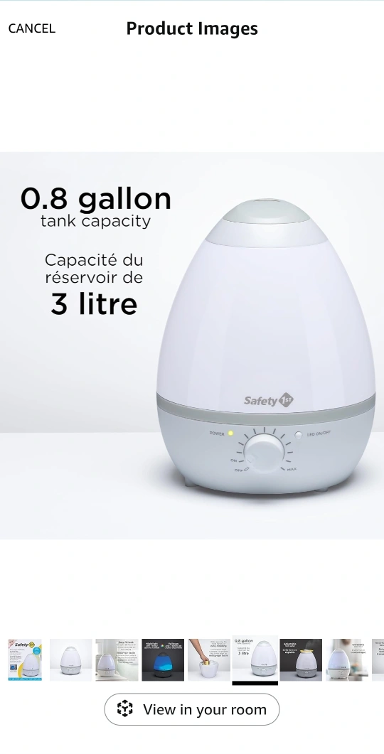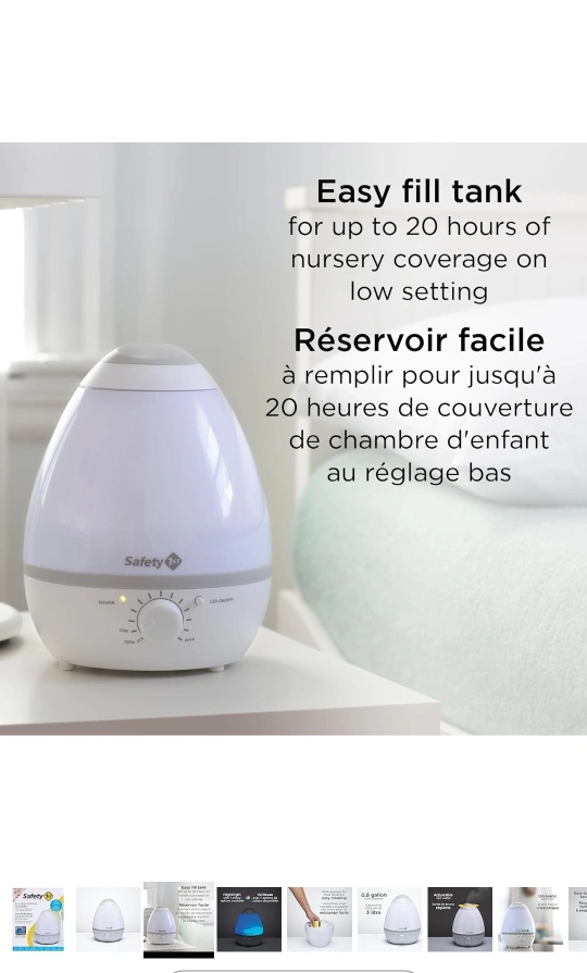 Ultrasonic cool mist humidifier. Egg-shaped design. Nightlight with seven colour options. Easy-fill tank. Up to 20 hours of nursery coverage on low setting. 0.8-gallon tank capacity.