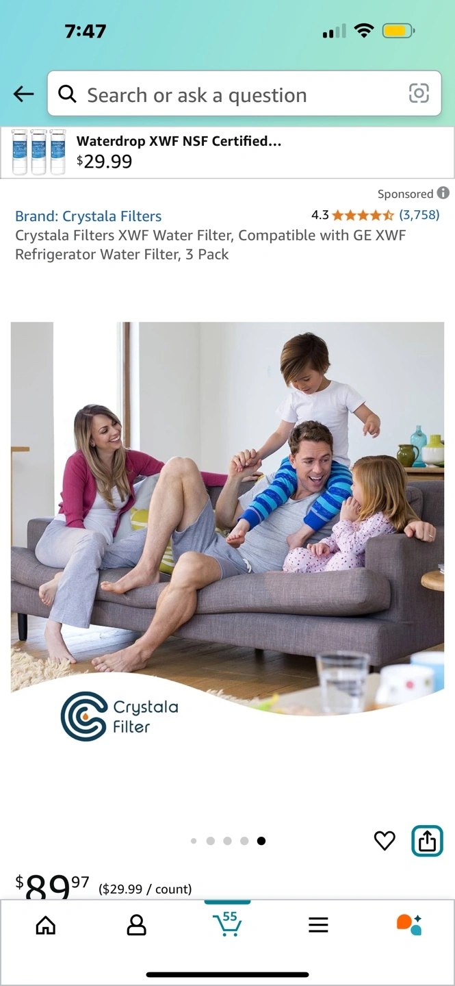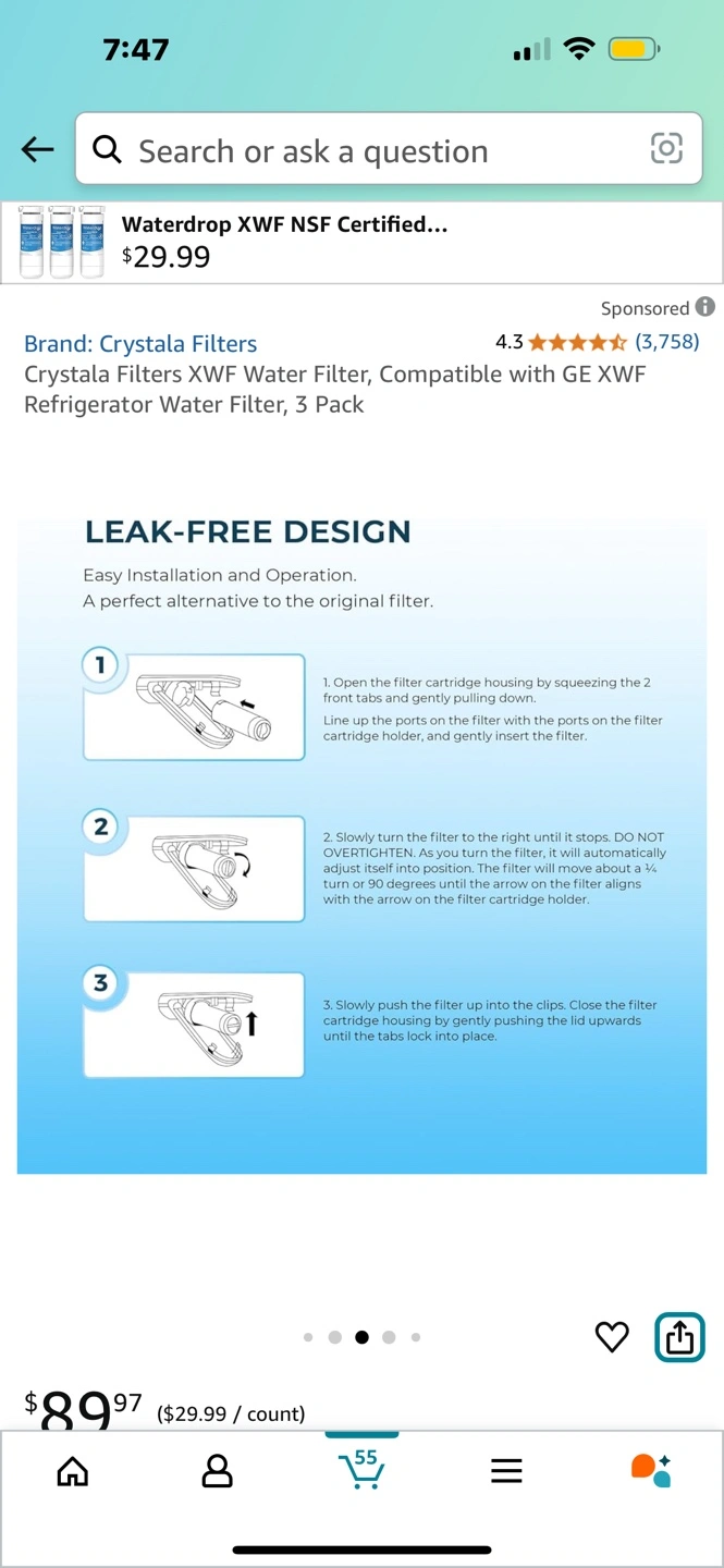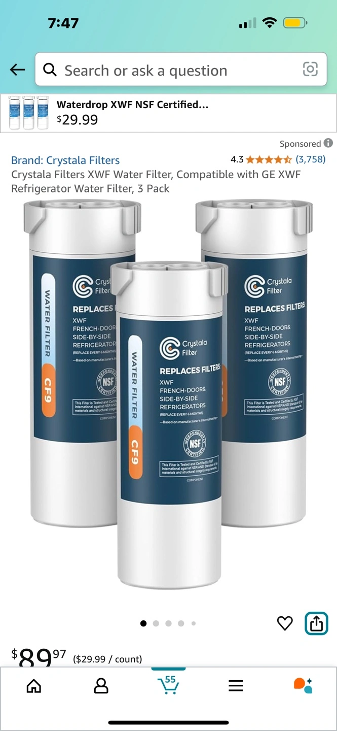 Three pack Crystala water filters. Compatible with GE XWF refrigerators. NSF certified. Easy installation. Leak-free design.